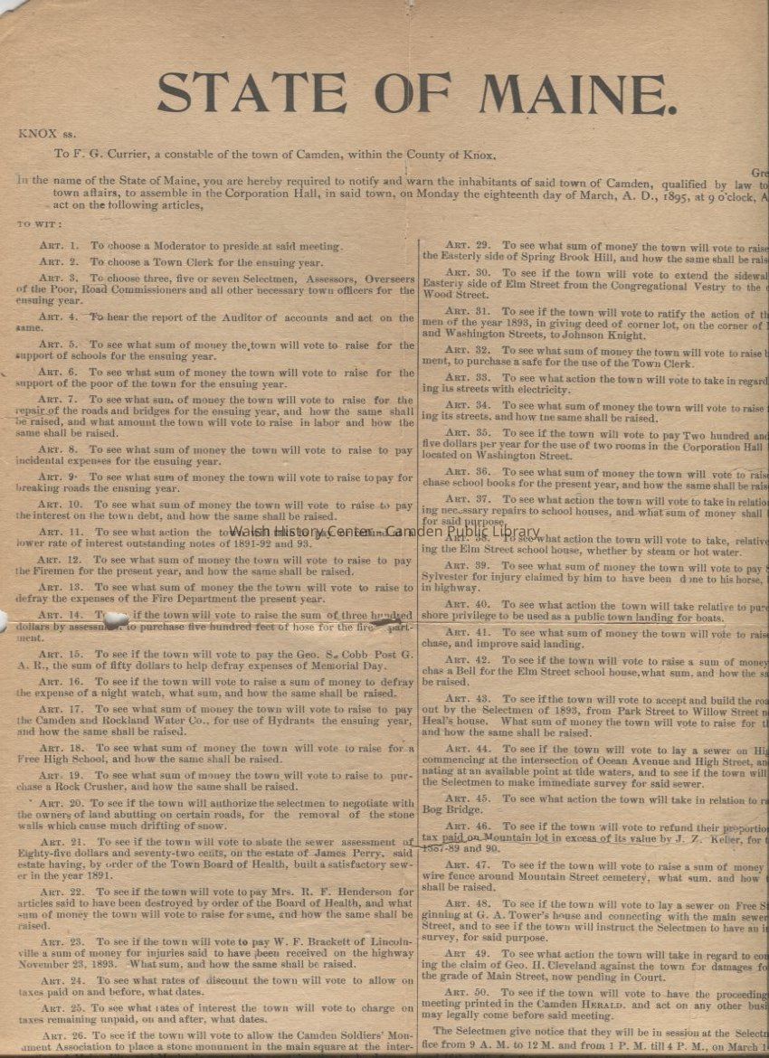 Warrent by Camden town selectmen J.H. Sherman, G.T. Hodgman, & E.N. Duffy, sent to F.G. Currier, a citizen of the Town of Camden, requiring him to notifiy the residents of the town to assemble in the Corporation Hall on 18 March 1895 to vote on 50 articles.Collection