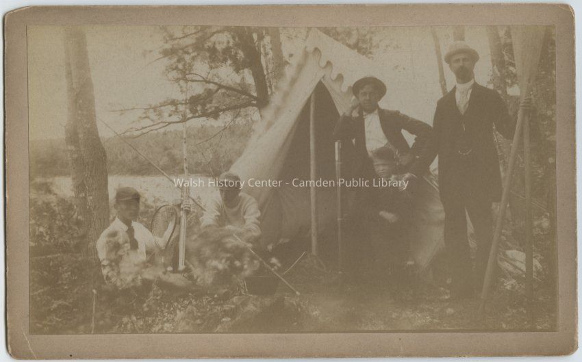 Photograph labeled "Camp Turner's [or Sumers?] Retreat, 1892," showing four young men and a small boy outside a waterside tent with fishing gear.Photograph Details