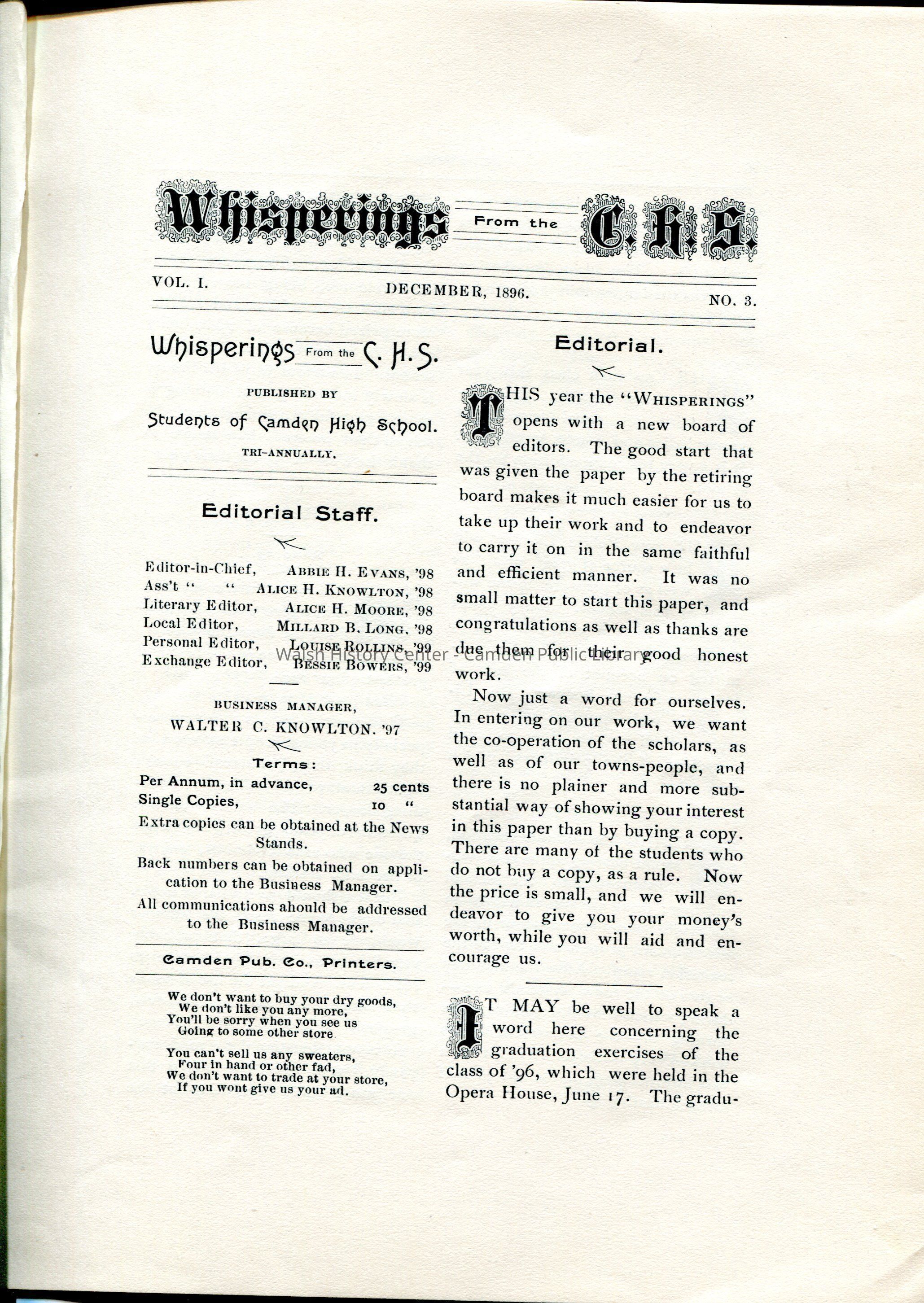Camden Herald, Camden High School Class of 1896, Camden Lumber Company, Carleton-Pascal Co., Curtis & Spear's, Duplex Roller Bushing Company, Follansbee & Wood Dry Goods, G.H. Talbot, Hodgman & Co., J. C. Curtis Hardware Store, J. W. Bowers, J.A. Brewster Fine Clothing, Knowlton Brothers, M.T. Crawford, Lawyer, Maine, Mixer's Candy Kitchen, S. B. Haskell, Wiley Brothers, Yearbook