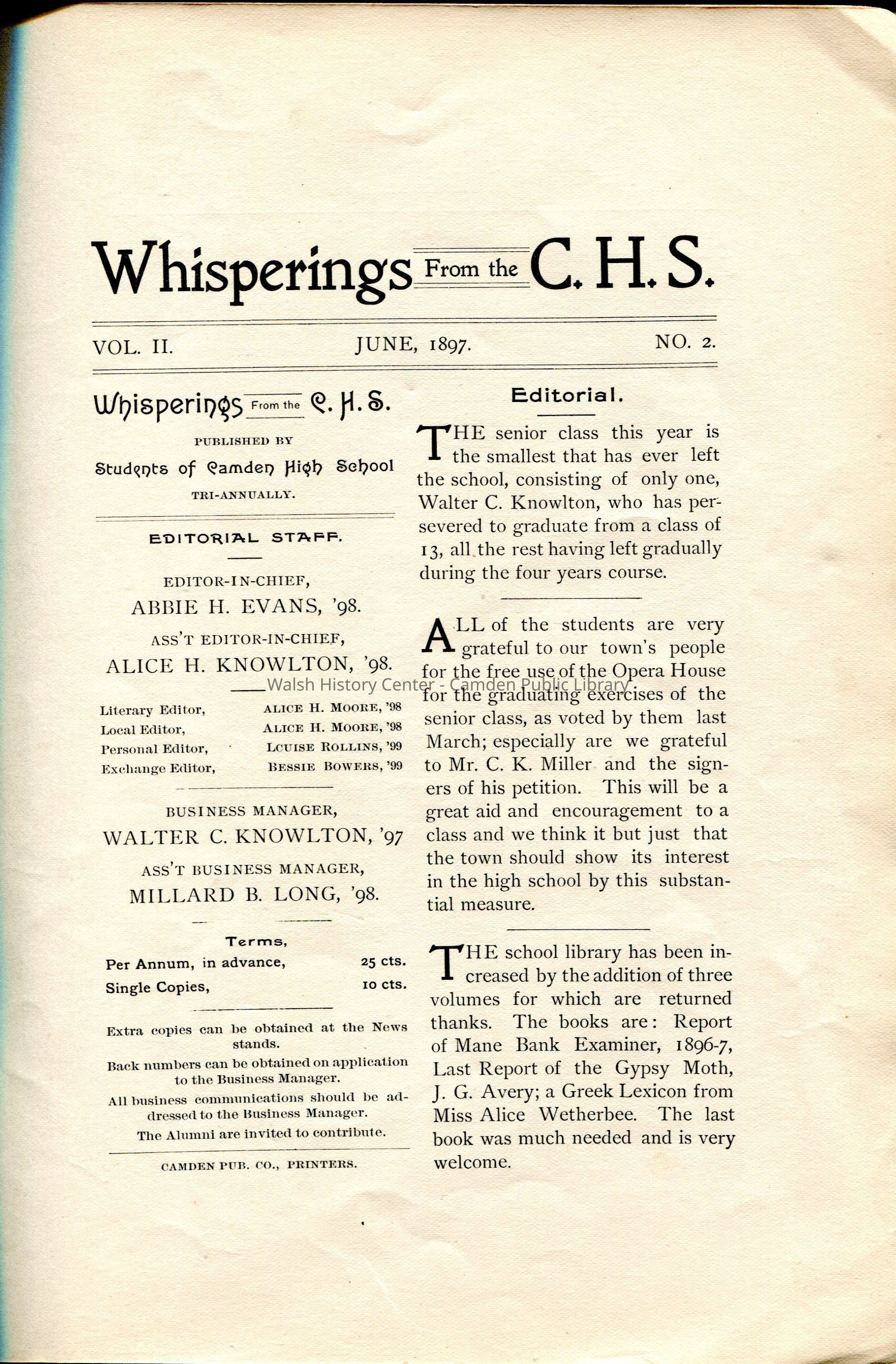 Camden Herald, Camden High School Class of 1897, Camden Lumber Company, Carleton-Pascal Co., Curtis & Spear's, Duplex Roller Bushing Company, Follansbee & Wood Dry Goods, G.H. Talbot, Hodgman & Co., J. C. Curtis Hardware Store, J. W. Bowers, J.A. Brewster Fine Clothing, Knowlton Brothers, M.T. Crawford, Lawyer, Maine, Mixer's Candy Kitchen, S. B. Haskell, Wiley Brothers, Yearbook