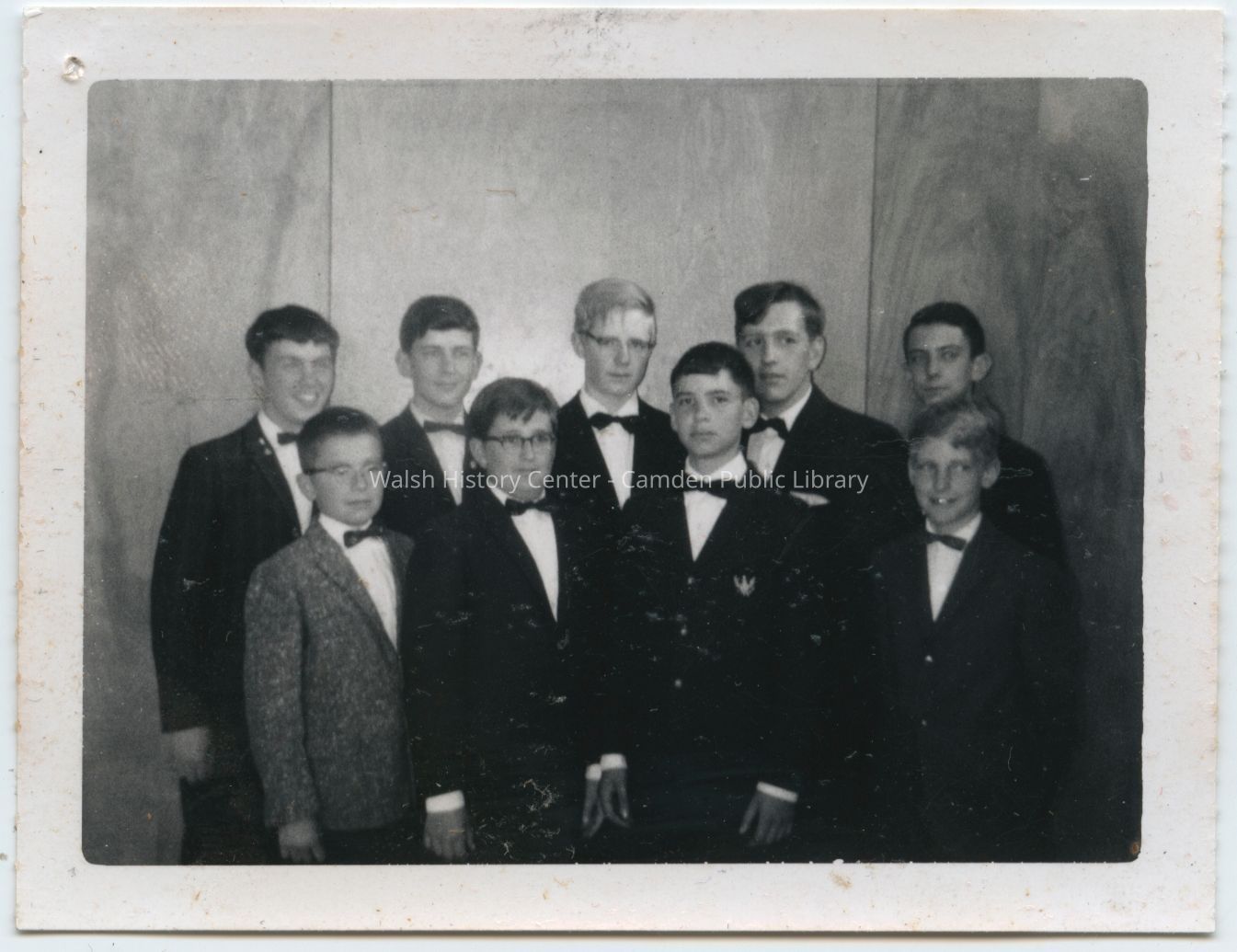 Black and white photograph of the "Whitely Warblers." They were a group of boys from Martha Whiteley's homeroom class that sang two and three part music. Front row from left: John McGowan (father Horace was principal in 1964), Martin Cates, David Koegle, Ken Gross. Back row: ? Grinnell, John Umberger, Peter Gross, Mark Philbrook and Dell Hyssong.Collection