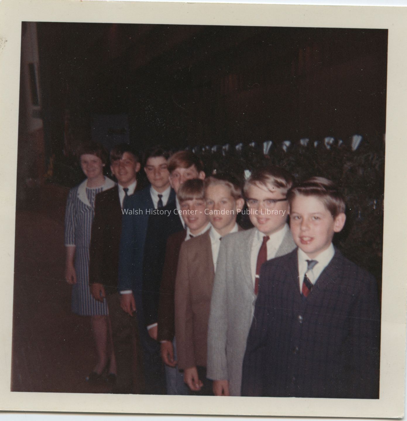 Color photograph of the "Whitely Warblers." They were a group of boys from Martha Whiteley's homeroom class that sang two and three part music. Music teacher Janice Parkinson Tucker is standing in back with Mark Philbrook in front of her and David Stanley second from right.Collection
