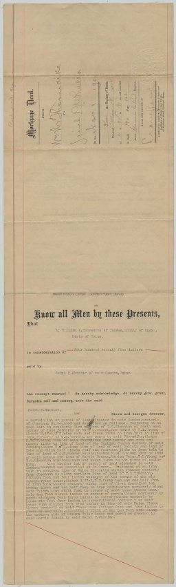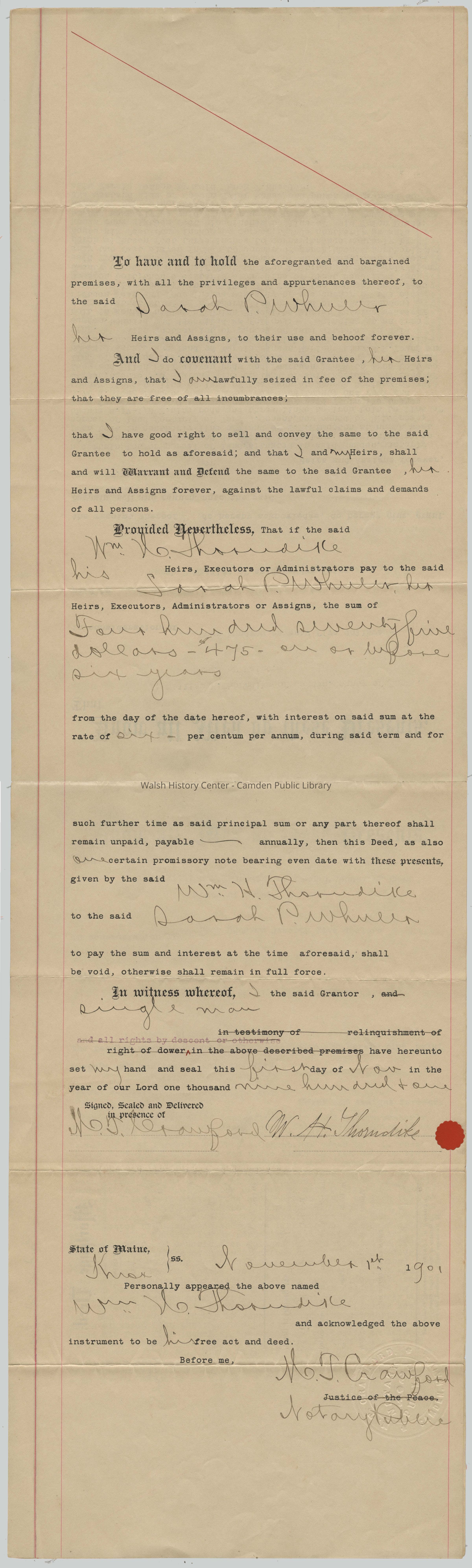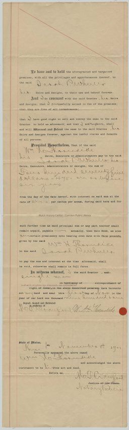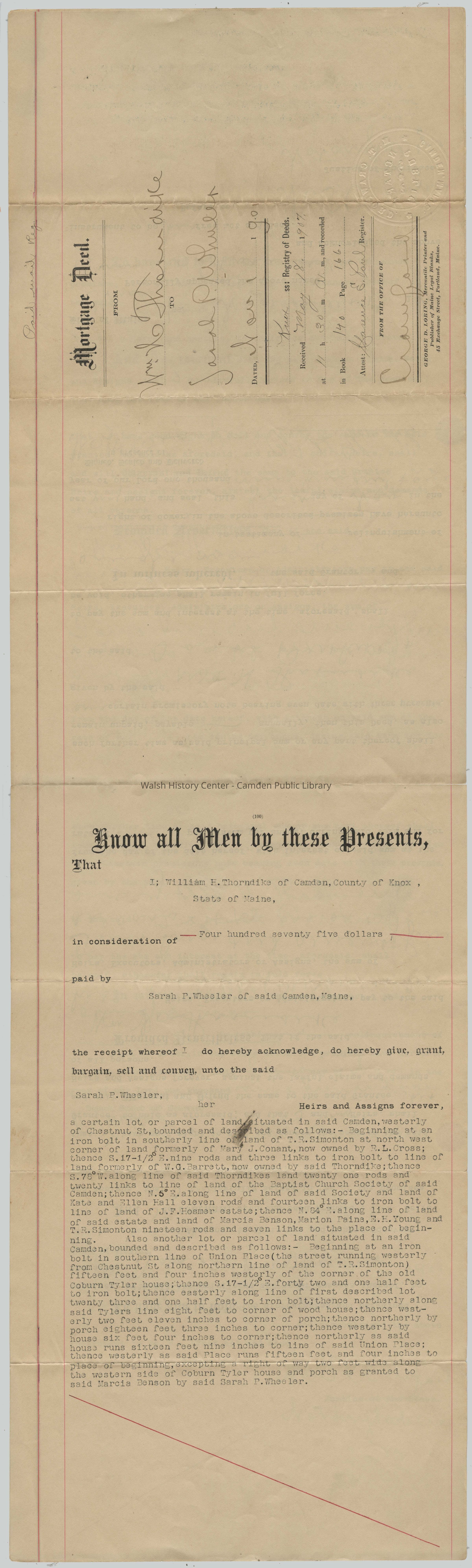 Know all Men by these Presents, That I; William E. Thorndike of Camden, County of Knox, State of Maine, in consideration of Four hundred seventy five dollars paid by Sarah P. Wheeler of said Camden, Maine, the receipt whereof I do hereby acknowledge, do hereby give, grant, bargain, sell and convey, unto the said Sarah P. Wheeler, her Heirs and Assigns forever, a certain lot or parcel of land situated in said Camden, westerly of Chestnut St. bounded and described as follows: - Beginning at an iron bolt in southerly line of land of T. R. Simonton at north west corner of land formerly of Mary J. Conant, now owned by R. L. Cross; thence S.17 ½ ° E. nine rods and three links to iron bolt to line of land formerly of W.G. Barrett, now owned by said Thorndike; thence S. 78° along line of said Thorndikes land twenty one rods and twenty links to line of land of the Baptist Church Society of said Camden; thence N. 5° E. along line of land of said Society and land of Kate and Ellen Hall eleven rods and fourteen links to iron bolt to line of land of J.F. Hosmer estate; thence N. 84° E along line of land of said estate and land of Marcia Benson, Marion Paine, E.H. Young and T.R. Simonton nineteen rods and seven links to the place of beginning. Also another lot or parcel of land situated in said Camden, bounded and described as follows:- Beginning at an iron bolt in southern line of Union Place (the street running westerly from Chestnut St along northern line of land of T.R. Simonton) fifteen feet and four inches westerly of the corner of the old Coburn Tyler house; thence S. 17 ½ ° E. forty two and one half feet to iron bolt; thence easterly along line of first described lot twenty three and one half feet to iron bolt; thence northerly along said Tylers line eight feet to corner of wood house; thence westerly two feet eleven inches to corner of porch; thence northerly by porch eighteen feet three inches to corner; thence westerly by house six feet four inches to corner; thence northerly as said house runs sixteen feet nine inches to line of said Union Place; thence westerly as said Place runs fifteen feet and four inches to place of beginning excepting a right of way two feet wide along the western side of Coburn Tyler house and porch as granted to said Marcia Benson by said Sarah P. Wheeler.
