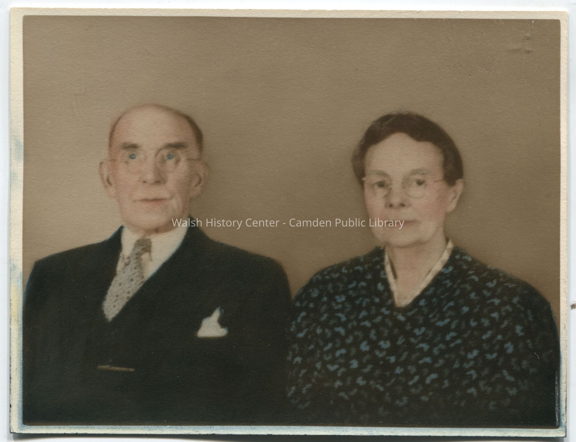 Photograph (hand-colored) of William Ellis Hatch and his wife Lena circa 1935. William Hatch was the builder of the Camden Public Library in 1928. William Ellis Hatch of Camden, Maine, who was awarded the contract for the library, was a native of Islesboro, where he was a carpenter, builder, and operator of a lumber yard and hardware store. He moved to Camden in 1923. According to family records, his son, engineer Loranus P. Hatch, helped design the library "dome" (presumably the cupola).Collection