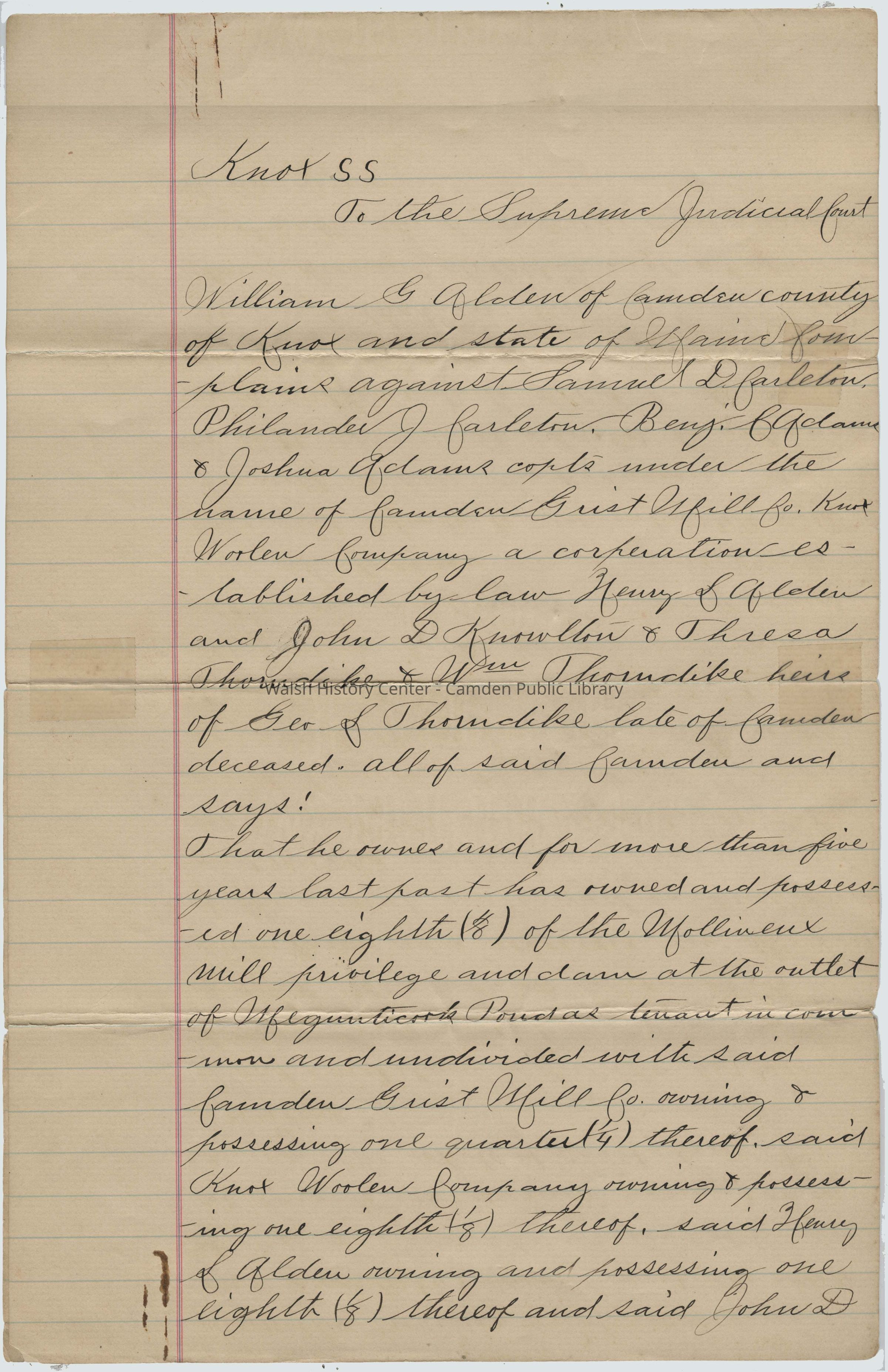 William g Alden of Camden county of Knox and state of Maine Complaint against Samuel D. Carleton, Philander J. Carleton, Benj C Adams & Joshua Adams copts under the name of Camden Grist Mill Co. Knox Woolen Company a cooperation established by law Henry L Alden and John D Knowlton and Thresa Thorndike and Wm Thorndike heirs of Geo S Thorndike late of Camden deceased, all of said Camden and says: