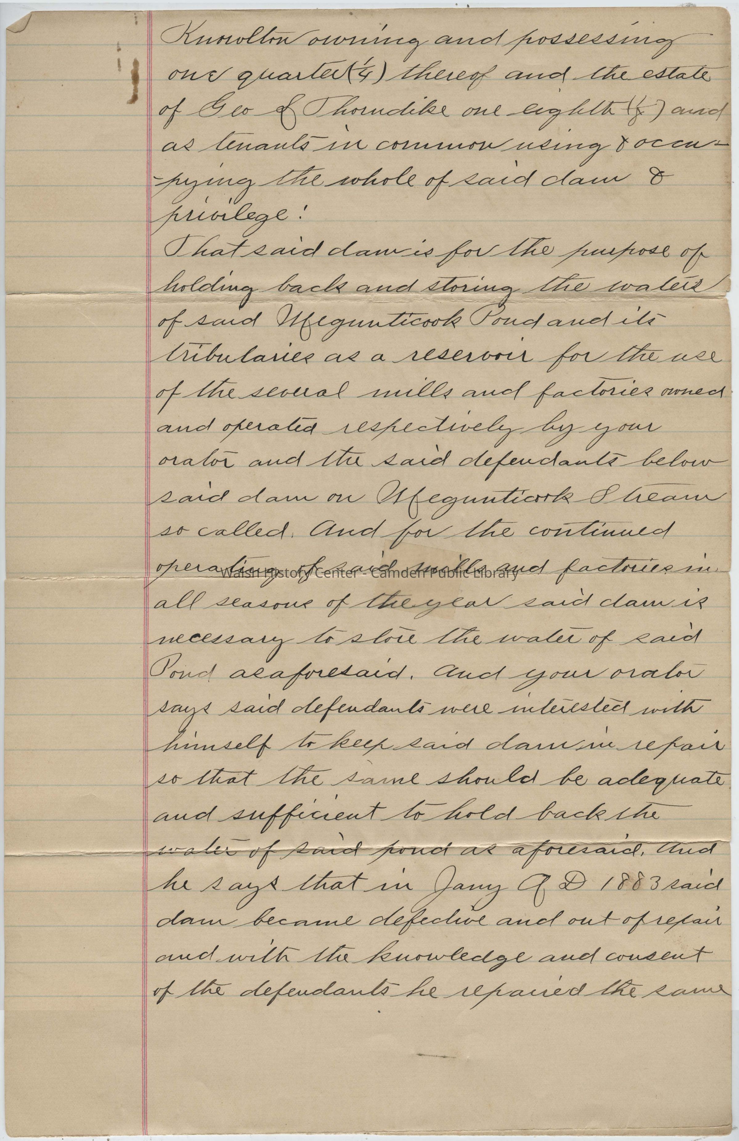 That he ownes and for more than five years last past has owned and possessed one eighth (1/8) of the Mollineux Mill privilege and dam at the outlet of Megunticook Pond a tenant in common and undivided with said Camden Grist Mill Co. owning & possessing one quarter (1/4) thereof said Knox Woolen Company owning & possessing one eighth (1/8) thereof, said Henry L Alden owning and possessing one eighth (1/8) thereof and said John D