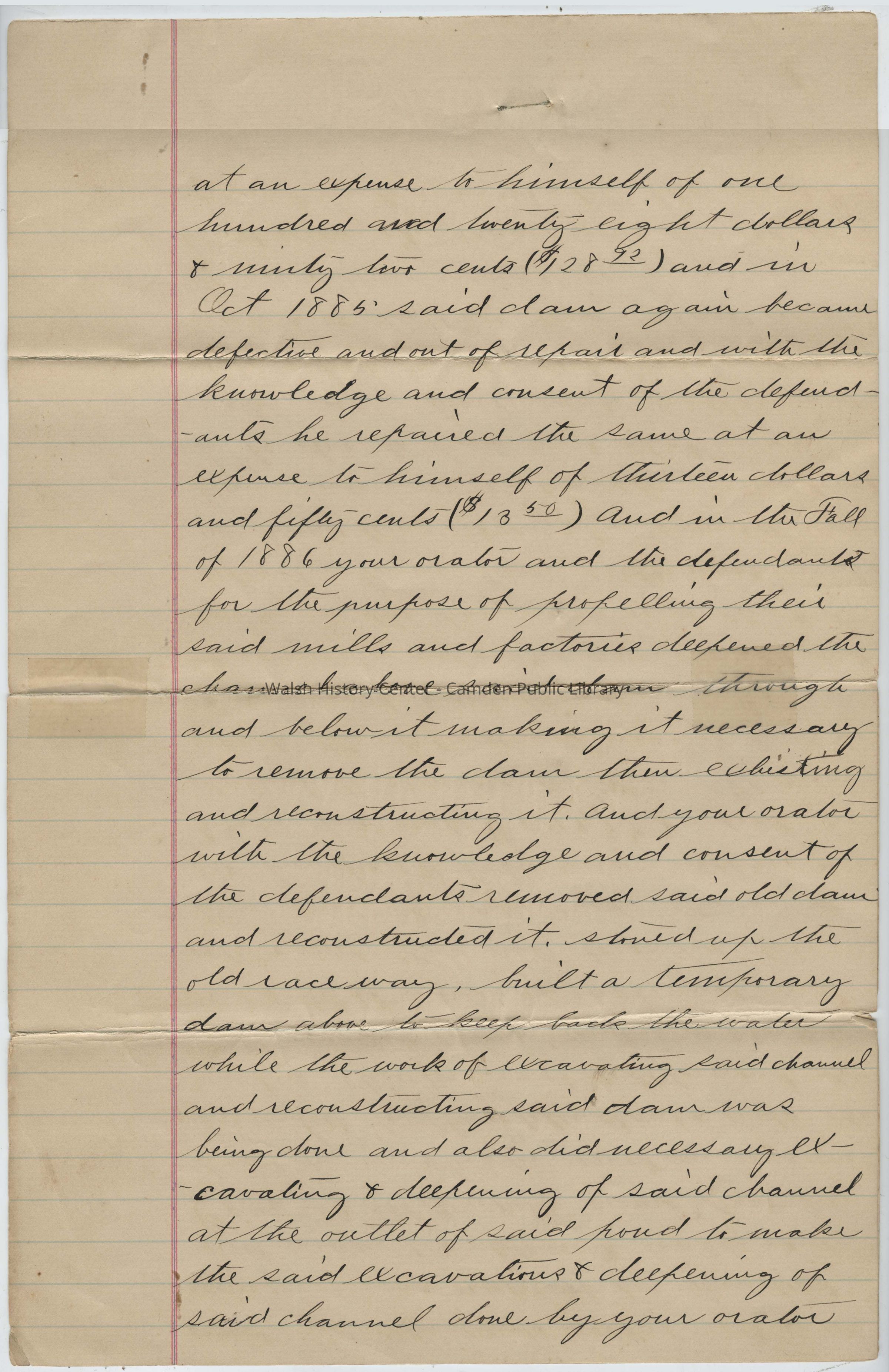 at an expense to himself of one hundred and twenty-eight dollars & ninety two cents ($128.92) and in Oct 1885 said dam again became defective and out of repair and with the knowledge and consent of the defendants he repaired the same at an expense to himself of thirteen dollars and fifty-cents ($13.50) and in the Fall of 1886 your orator and the defendants for the purpose of propelling their said mills and factories deepened the channel above said dam through and below it making it necessary to remove the dam then exhisting and reconstructing it. And your orator with the knowledge and consent of the defendants removed said old dam and reconstructed it, stoned up the old race way, built a temporary dam above to keep back the water while the work of excavating said channel and reconstructing said dam was being done and also did necessary excavating & deepening of said channel at the outlet of said pond to make the said excavations and deepening of said channel done by your orator