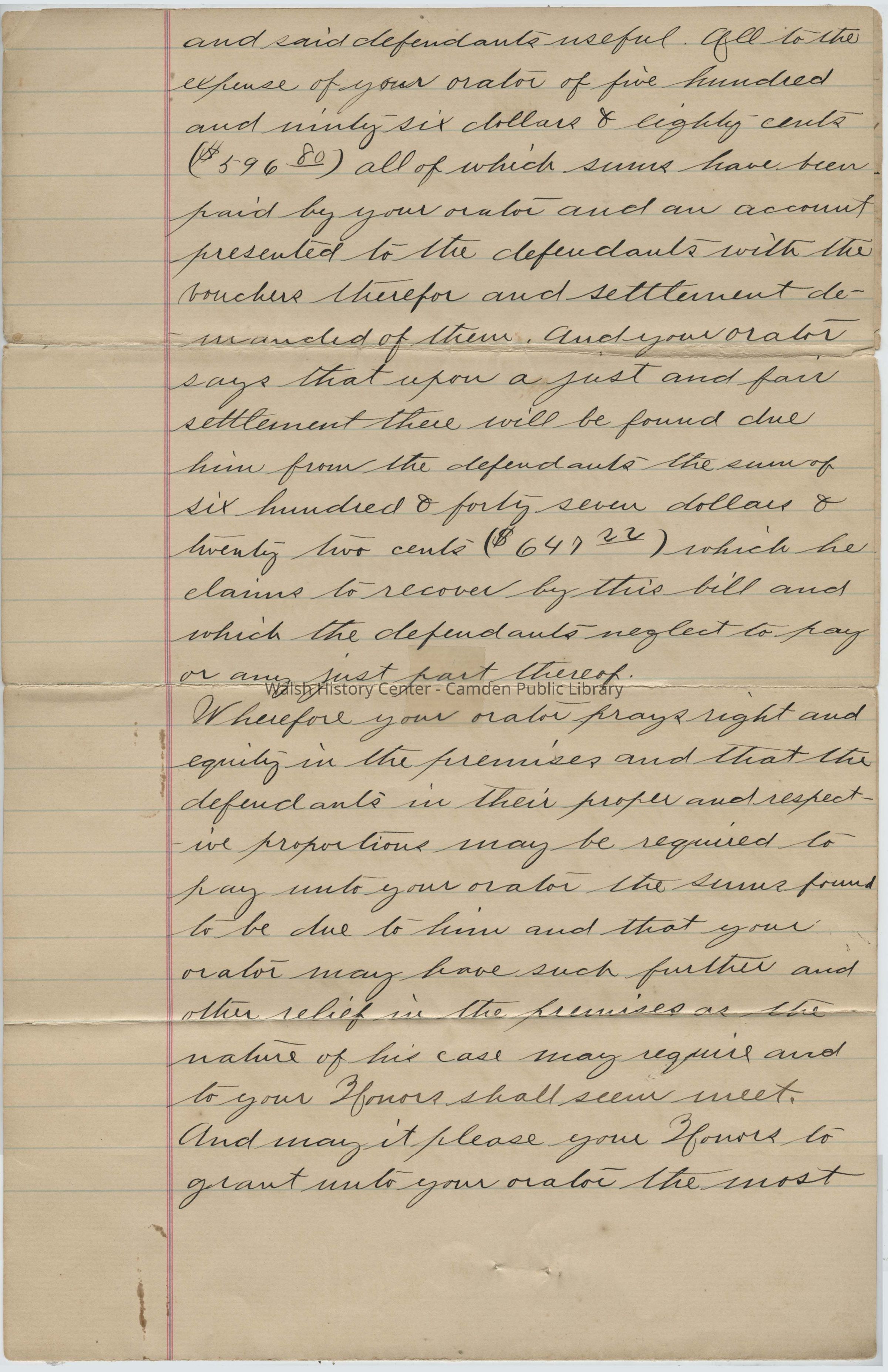 and said defendants useful. All to the expense of your orator of five hundred and ninty-six dollars & eighty-cents ($596.80) all of which sums have been paid by your orator and an account presented to the defendants with the vouchers therefore and settlement demanded of them. And your orator says that upon a just and fair settlement there will be found due him from the defendants the sum of six hundred & forty-seven dollars & twenty two cents ($647.22) which he claims to recover by this bill and which the defendants neglect to pay or any just past thereof.