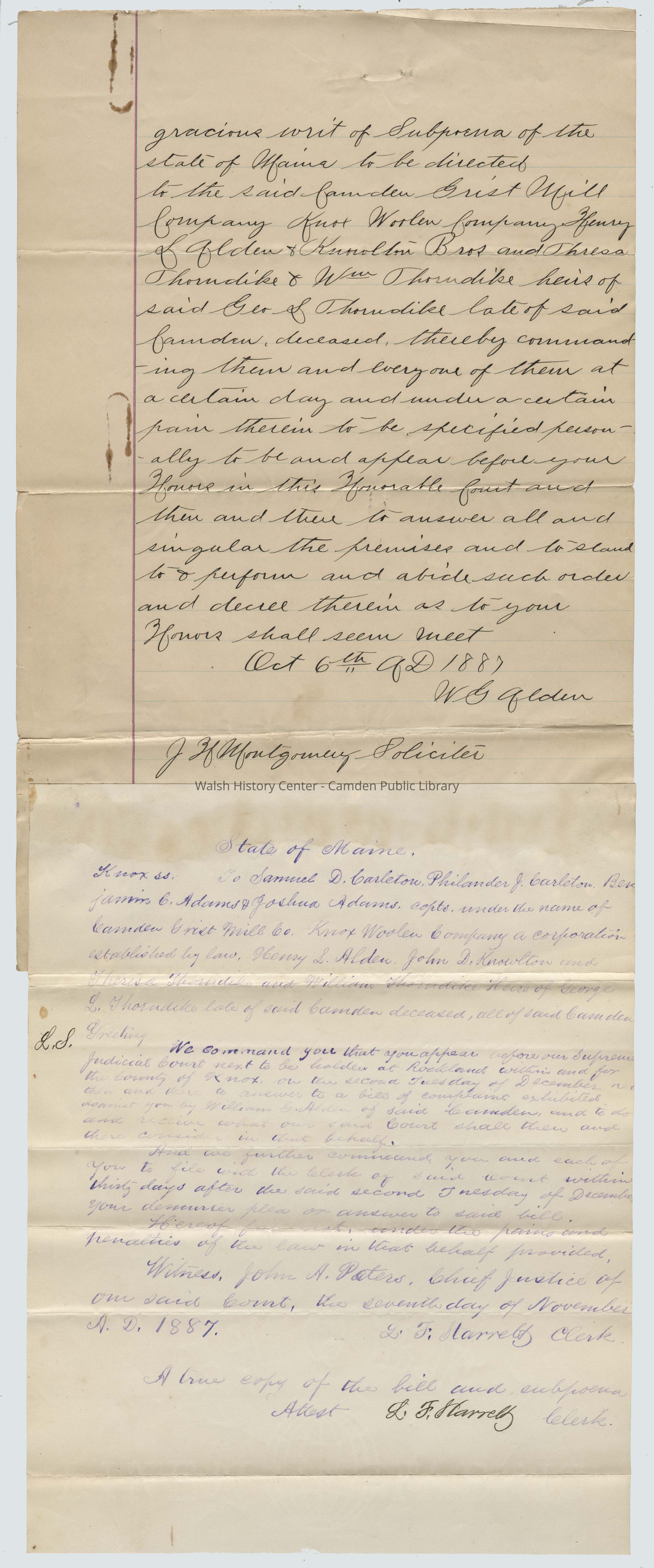LAWSUIT AND ORDER TO APPEAR WILLIAM G. ALDEN VS. CAMDEN GRIST MILL ET. ALS, OCTOBER 6, 1887