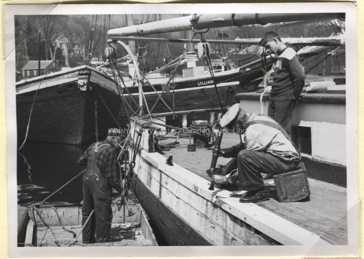 Black and white photograph by William Cross of 2 men working on the windjammers with a young boy watching them.Collection