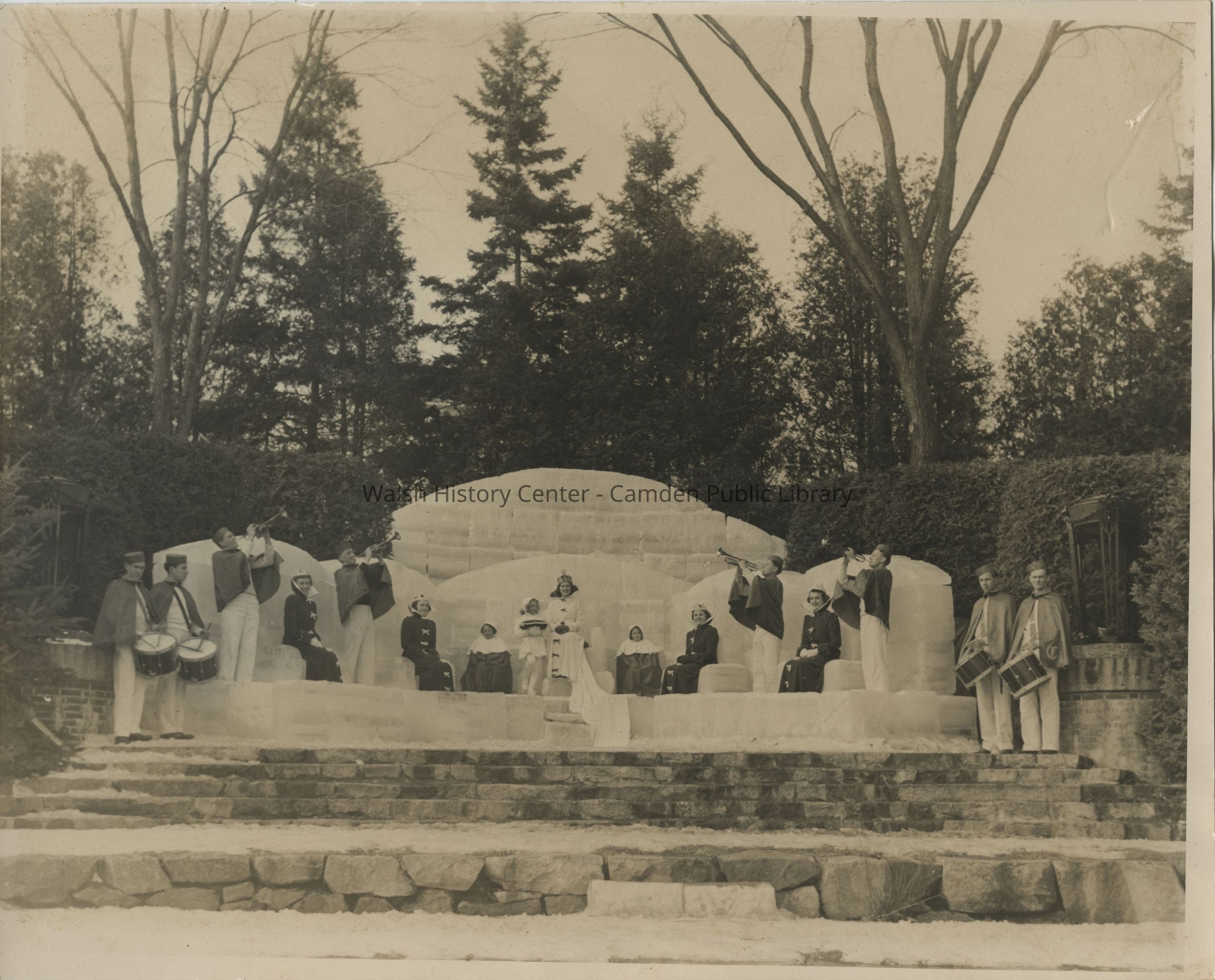 Camden Winter Carnival Ice Court showing queen and seven attendants plus drummers and trumpeters in costume. The Winter Carnival was held for a few years before WWII (c 1935-1941).Collection