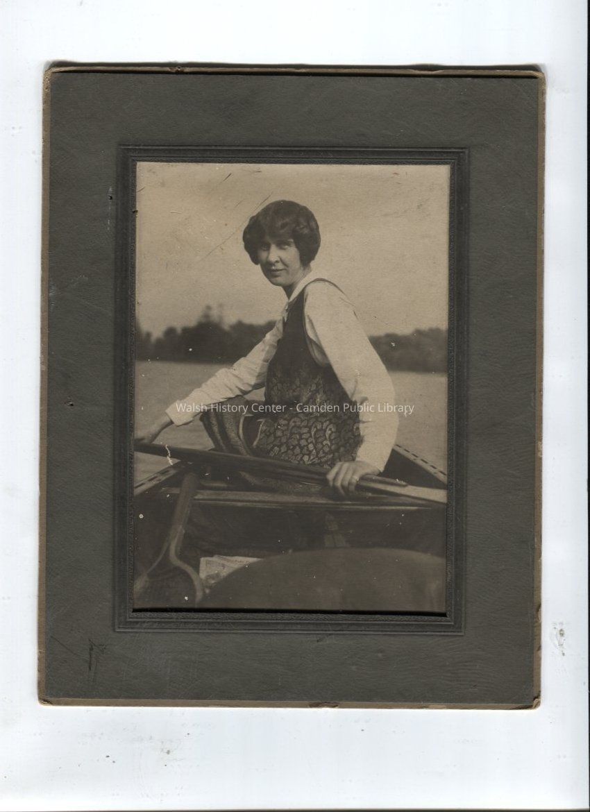 Sepia photograph of a woman seated in a rowboat. Back of photo is labeled in pen, "To Little Katie, with best Christmas wishes and much love from Mary, 1927." "Miss Rice" is written in pencil on the back.Collection