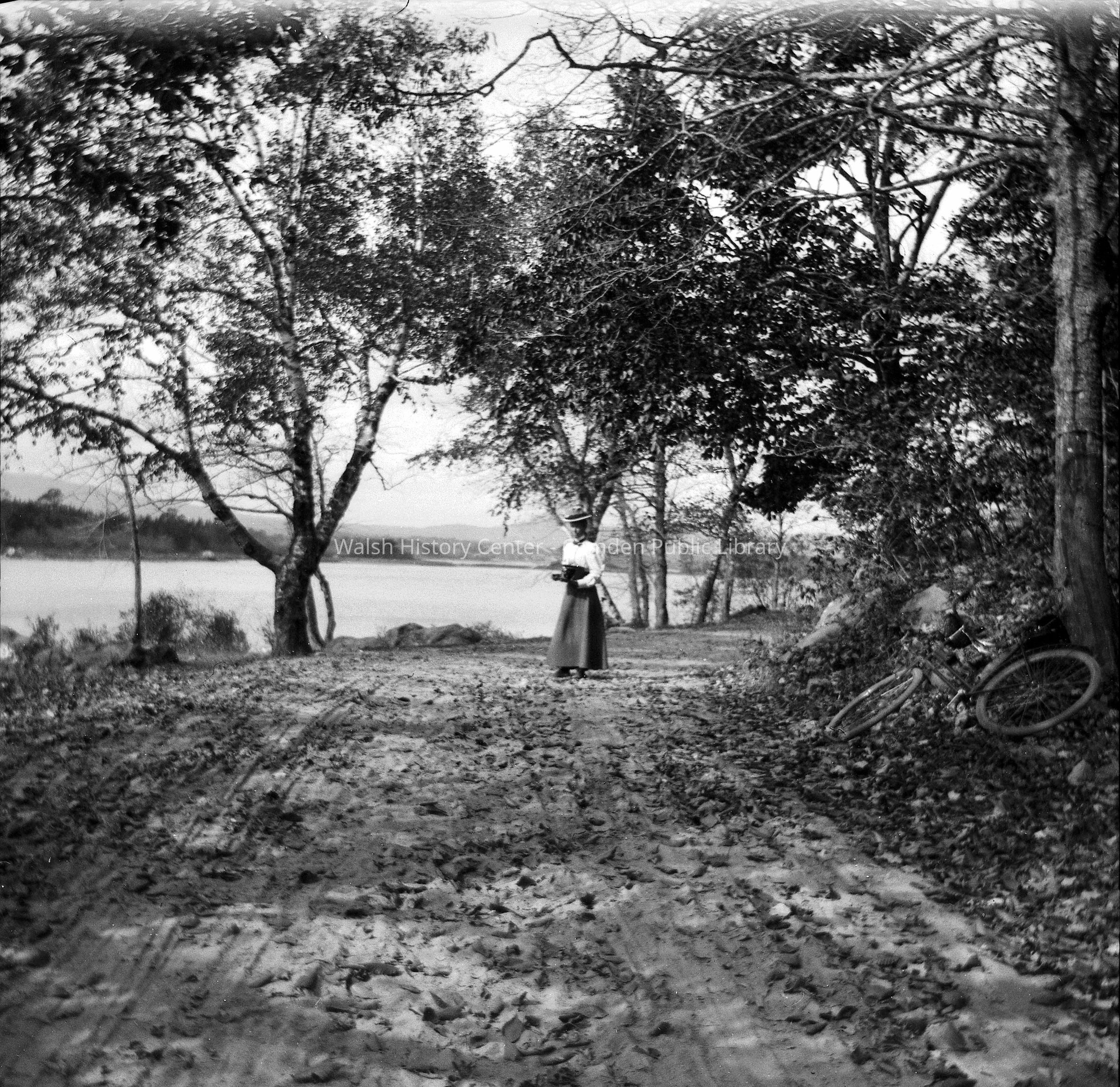 Photograph of a woman walking along Turnpike Drive (now Route 52) along Megunticook Lake in Camden, Maine in October 1899. She is carrying a box camera and there is a bicycle lying on the ground nearby.Collection