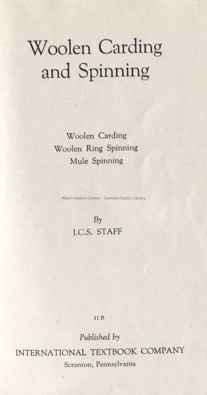 Wool carding and spinning textbook. Covers manufacturing operations and processes and practical knowledge of weaving specifically for the production of woolen yarns.
