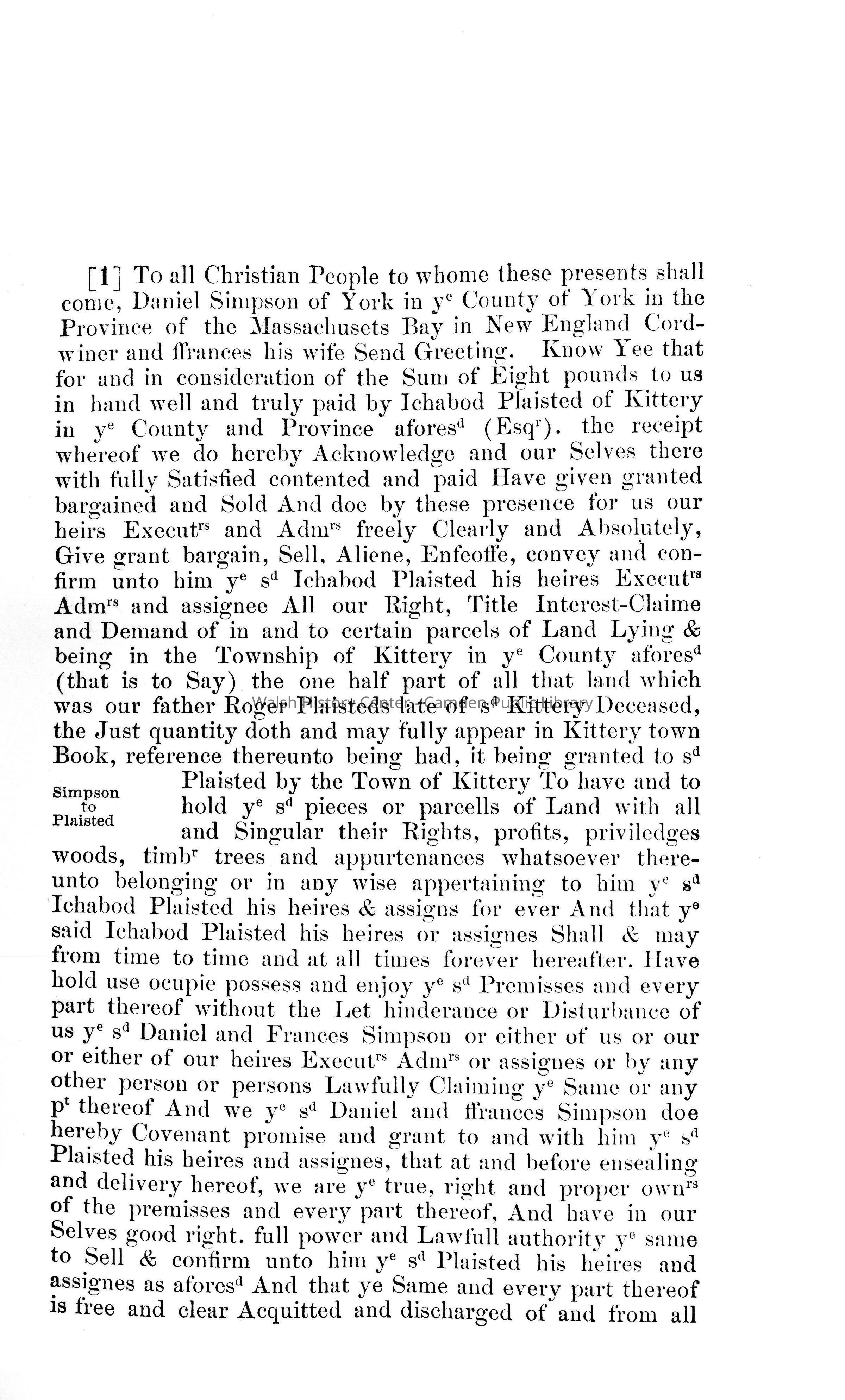 Reprint transcribed by the Maine Historical Society, of York deeds from May 29, 1704 through July 7, 1713 and including grantors, grantees, other persons and places. Edited by William M. Sargent until his death, and continued by Leonard B. Chapman.Collection