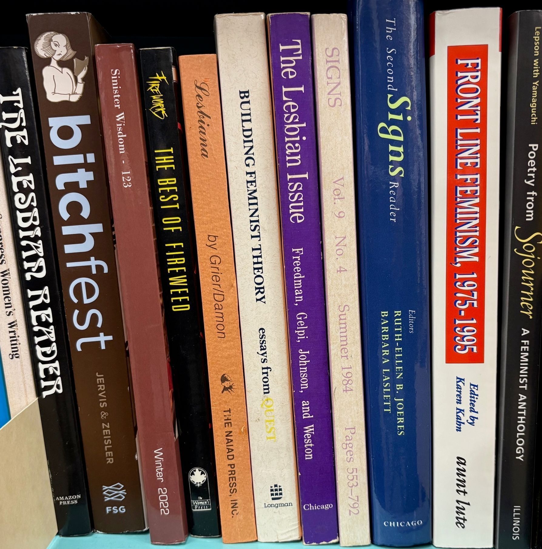 Lesbian Reader (Amazon Quarterly); Bitchfest (Bitch Magazine); Firegorks (The Best of Fireweed); Lesbiana (Book Reviews from the Ladder); Buidling Feminist Theory (Quest); The Lesbian Issues (Signs); The Lesbian Issues (Signs, Summer 1984 9:4); The Second Sign Reader (Signs); Poetry from Sojourner (Sojourner); Frontline Feminism (Sojourner)
