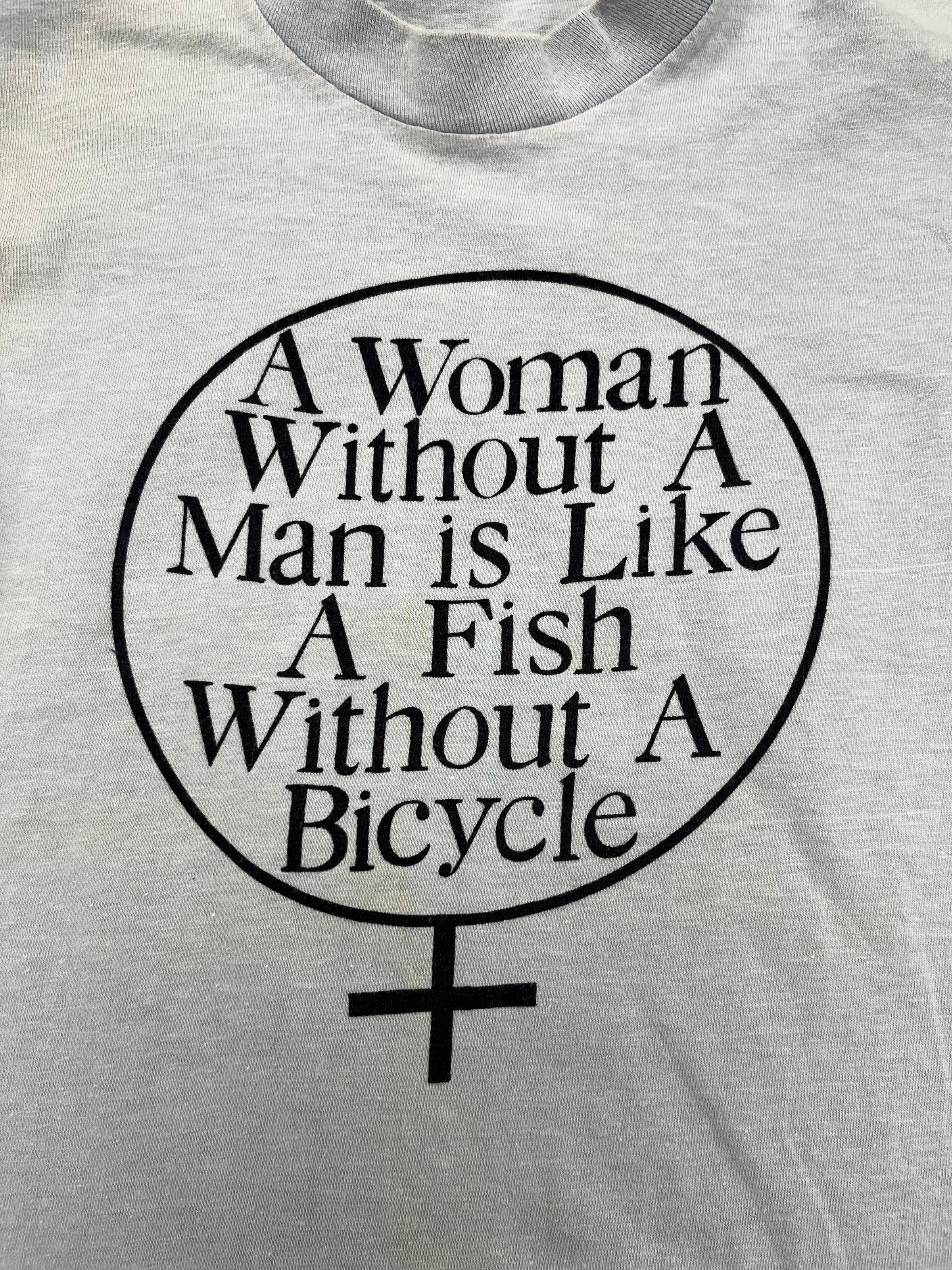 This phrase means that a woman can live a complete and independent life without needing a man, emphasizing female empowerment and autonomy. It was popularized as a feminist slogan in the 1970s, originally coined by Irina Dunn.Clothing/Dress/Costume Details