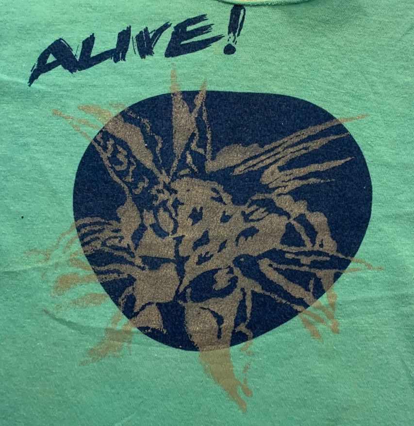 Flower in circle. Promotes Alive!, a jazz band.Clothing/Dress/Costume Details
