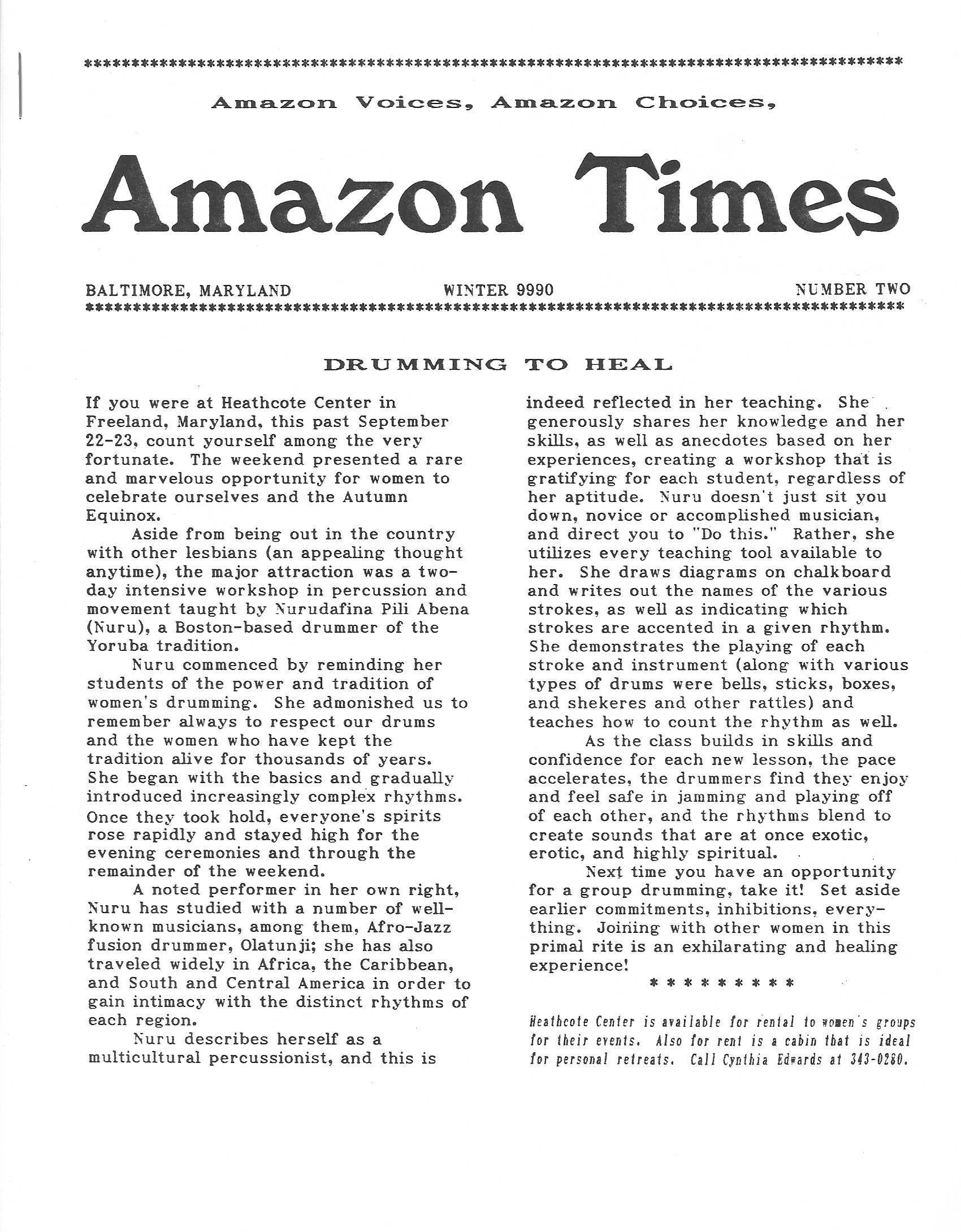 Grassroots newsletter publishing original, primarily nonfiction, writing by Lesbians. It featured articles on health and wellness; events of interest to Lesbians and women generally; and book reviews. Contained a classified section for Lesbian-run business and services.