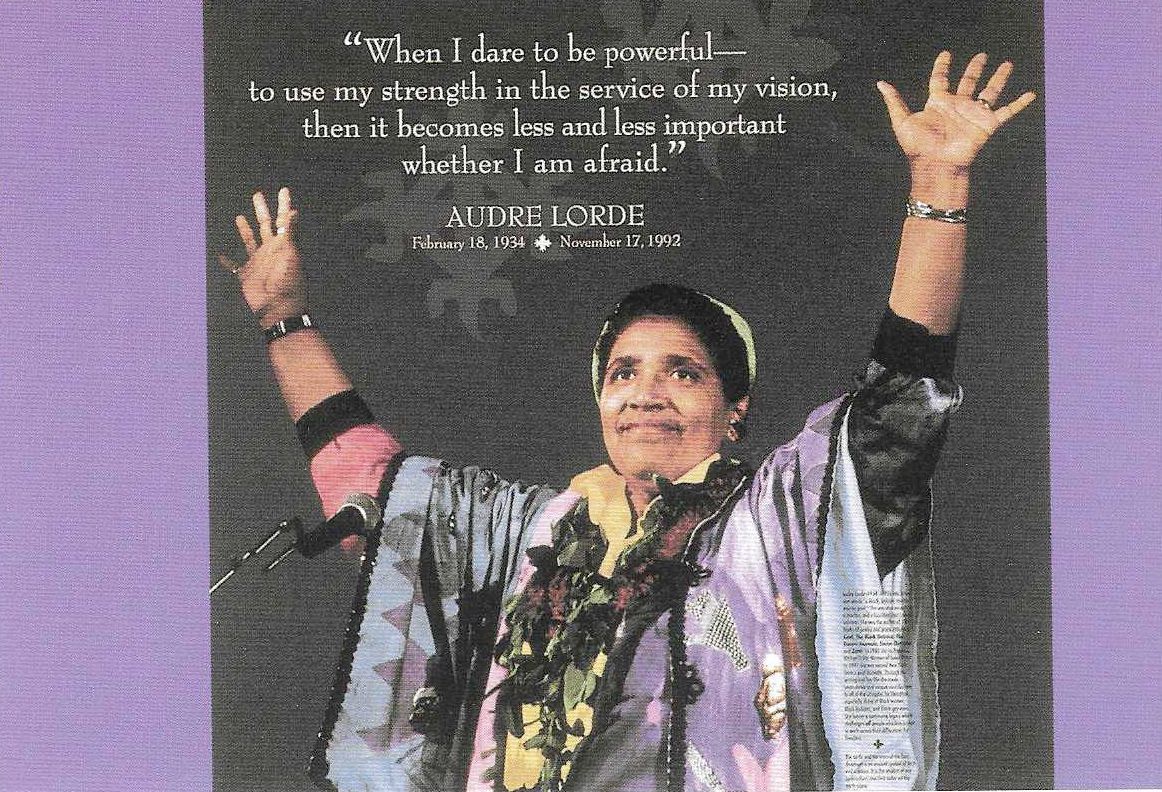 Postcard with photo of Audre Lorde with quote "When I dare to be powerful - to use my strength in the service of my vision, then it become less and less important whether I am afraid."Artwork Details