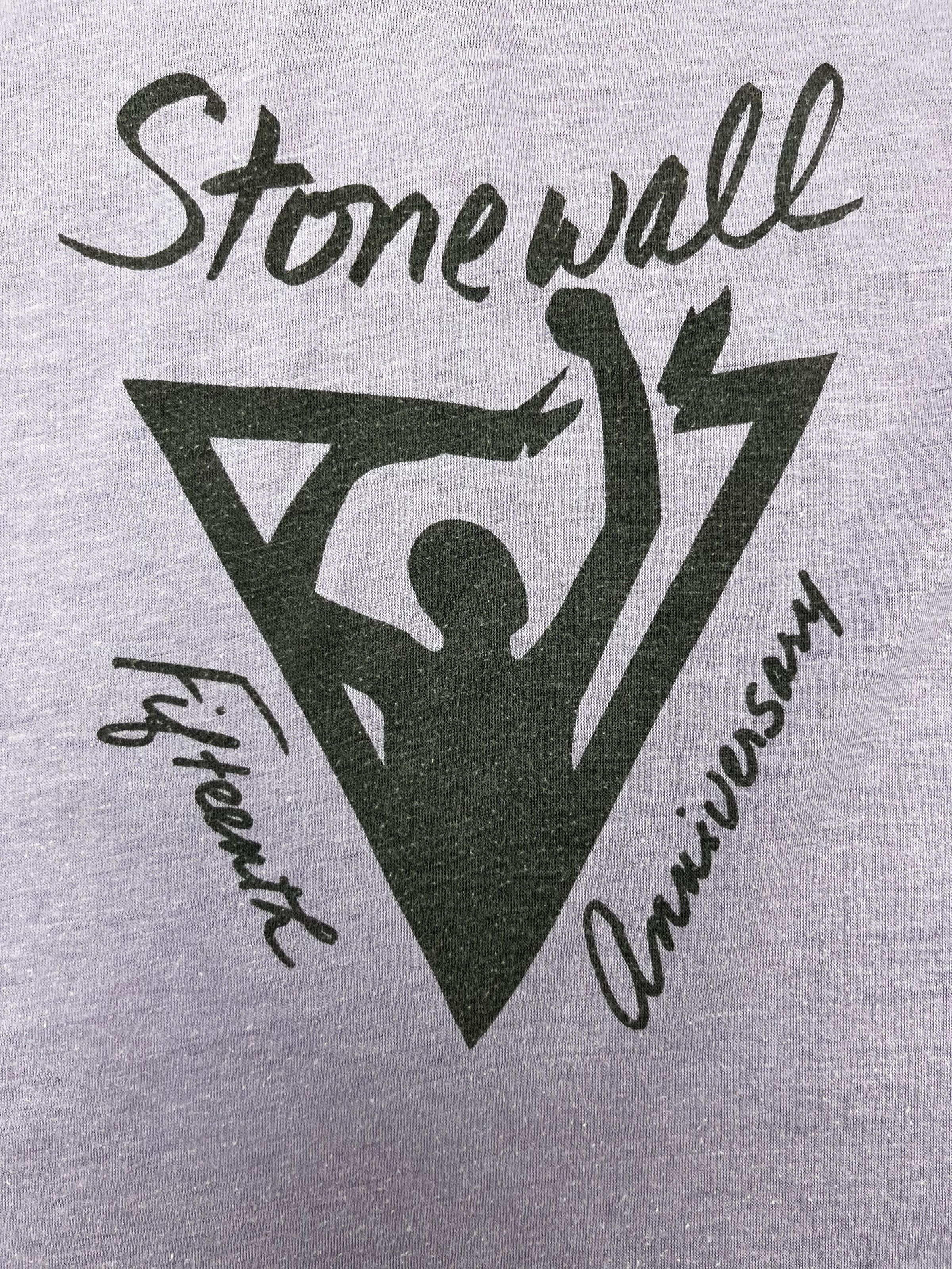 Purple t-shirt with black graphic. Image of a person breaking through the barrier of an upside-down triangle. Text: Stonewall 15th AnniversaryContext