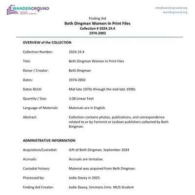 Beth Dingman is a feminist activist, printer, and co-founder of New Victoria Publishers, a women-run printing and publishing collective established in 1975. Dingman helped form an alternative, women-operated printing space modeled on collective labor and socially engaged publishing.In 1985, Dingman transitioned with collaborator Claudia McKay from printing services to full-scale publishing as New Victoria Publishers, shifting toward fiction and nonfiction works authored by Lesbian writers. Through New Victoria’s operation from 1975 to 2007, Dingman contributed meaningfully to feminist print culture, the development of independent women-owned publishing in the United States, and the preservation and dissemination of Lesbian creative and political expression.Collection