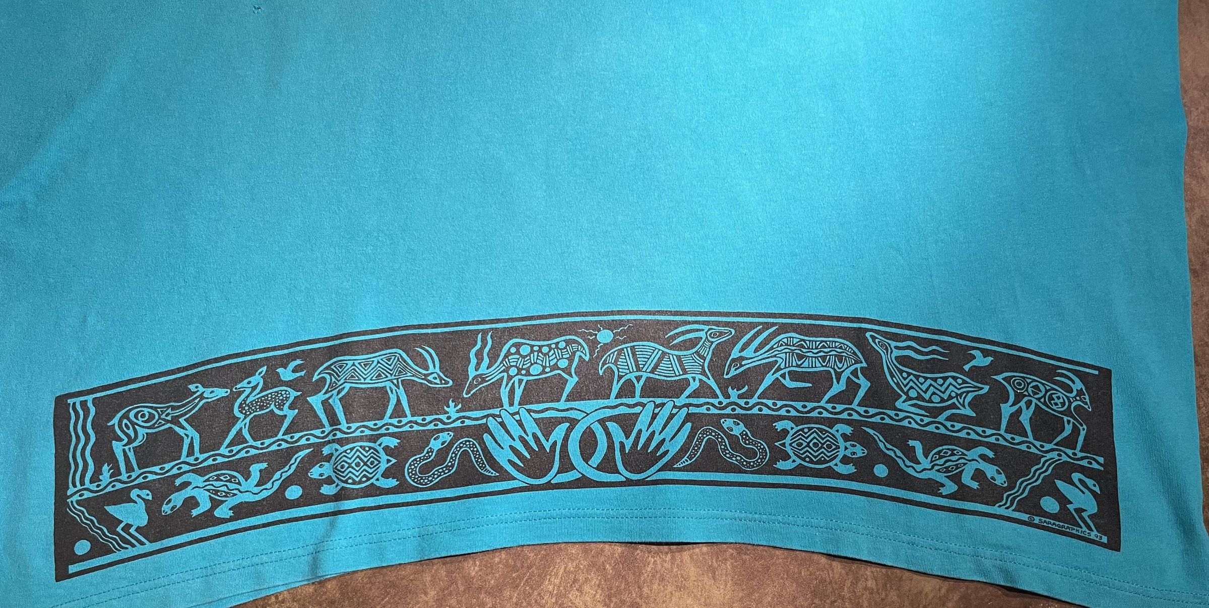Woman in center of circle holding the planet earth with images of animals in circle border - Bless our earth, celebrate the goddessClothing/Dress/Costume Details
