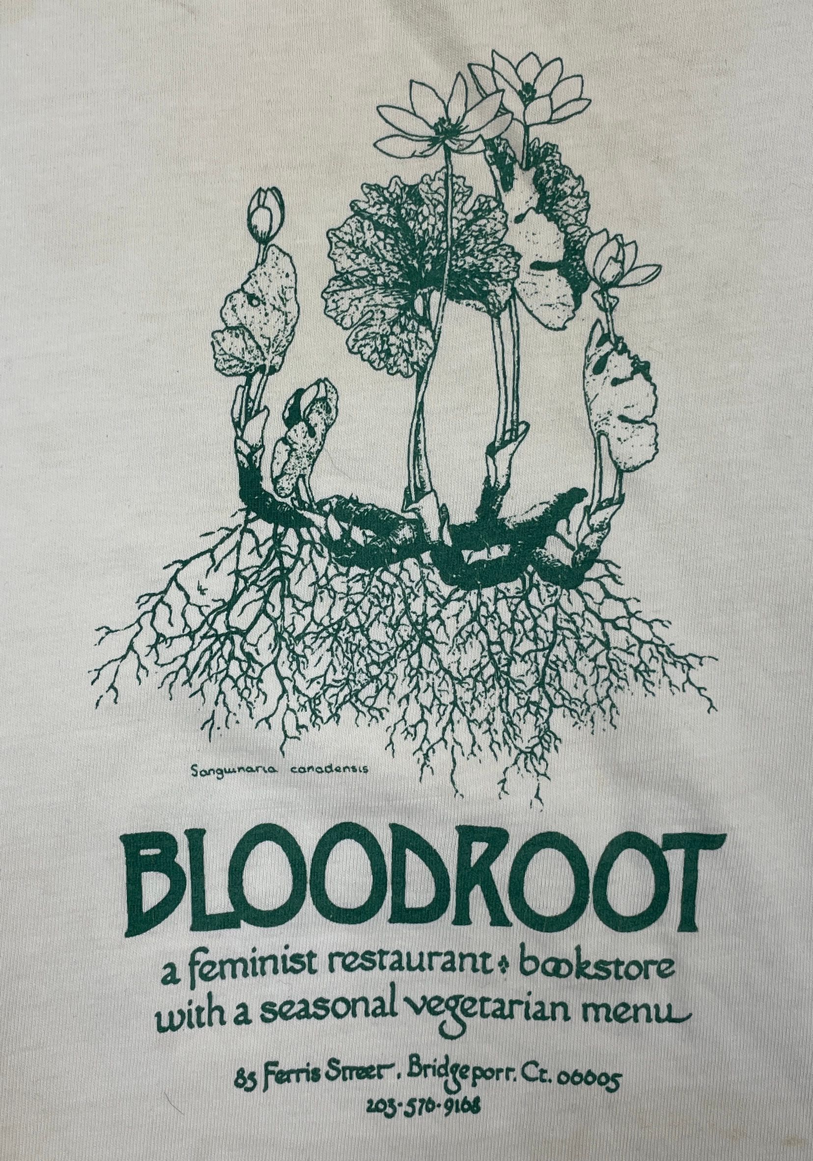 Drawn image of Sanguinaria Canadensis- Bloodroot, a feminist restaurant + bookstore with a seasonal vegetarian menu. Also has full address of restaurantUse