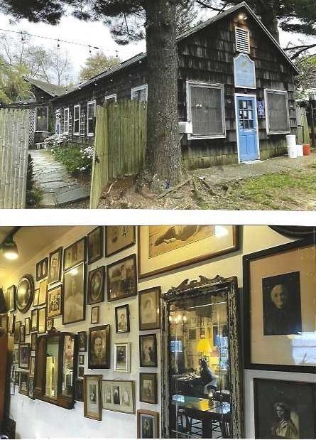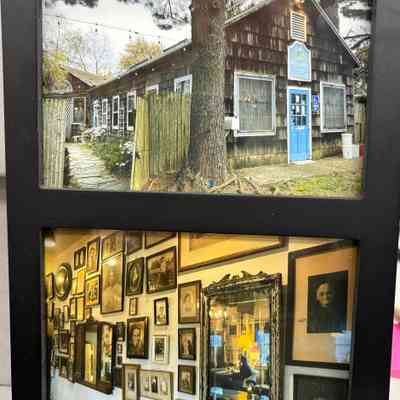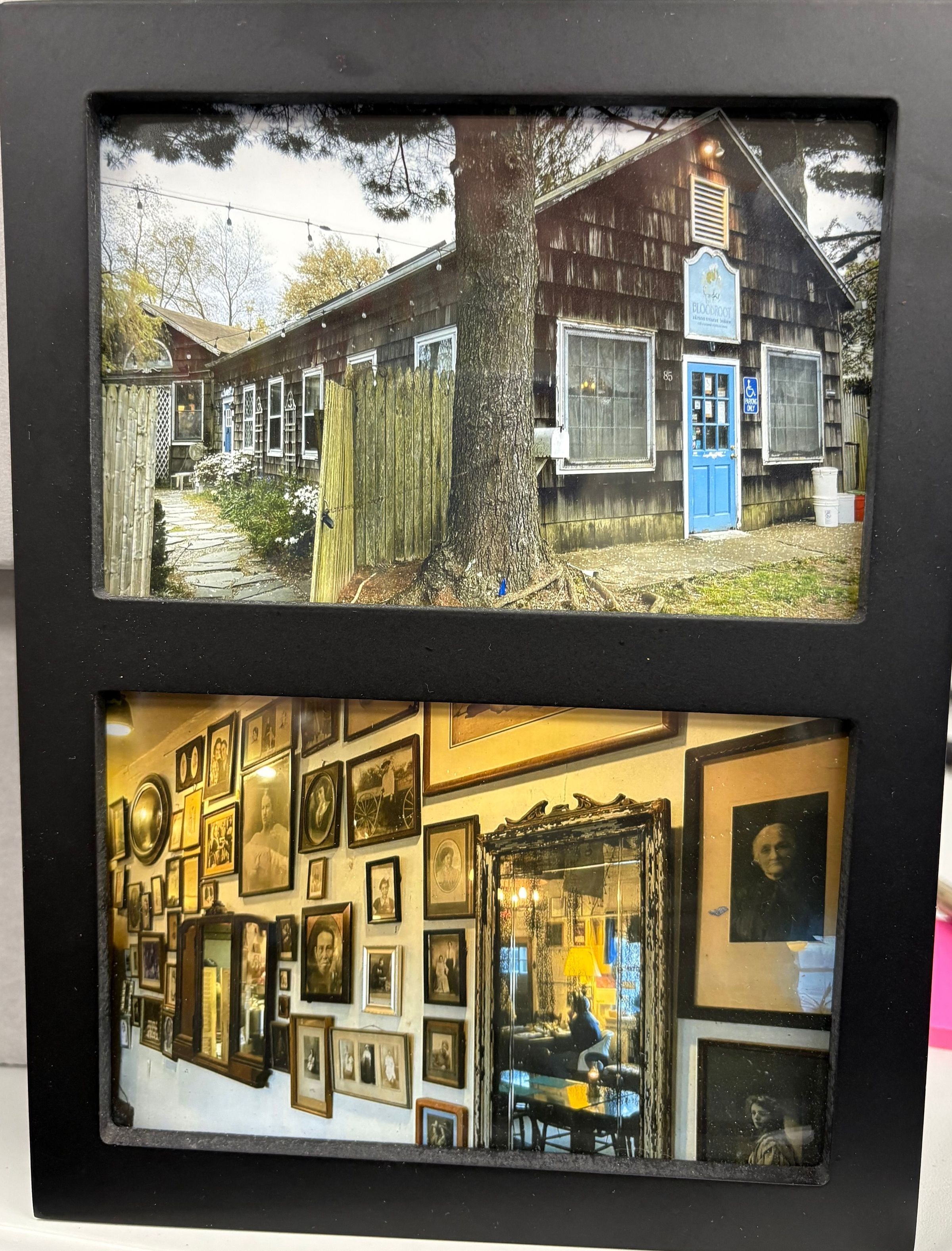 Two framed photographs. One of outside building from street looking into patio area. The second show inside restaurant - photograph wall.Photograph Details