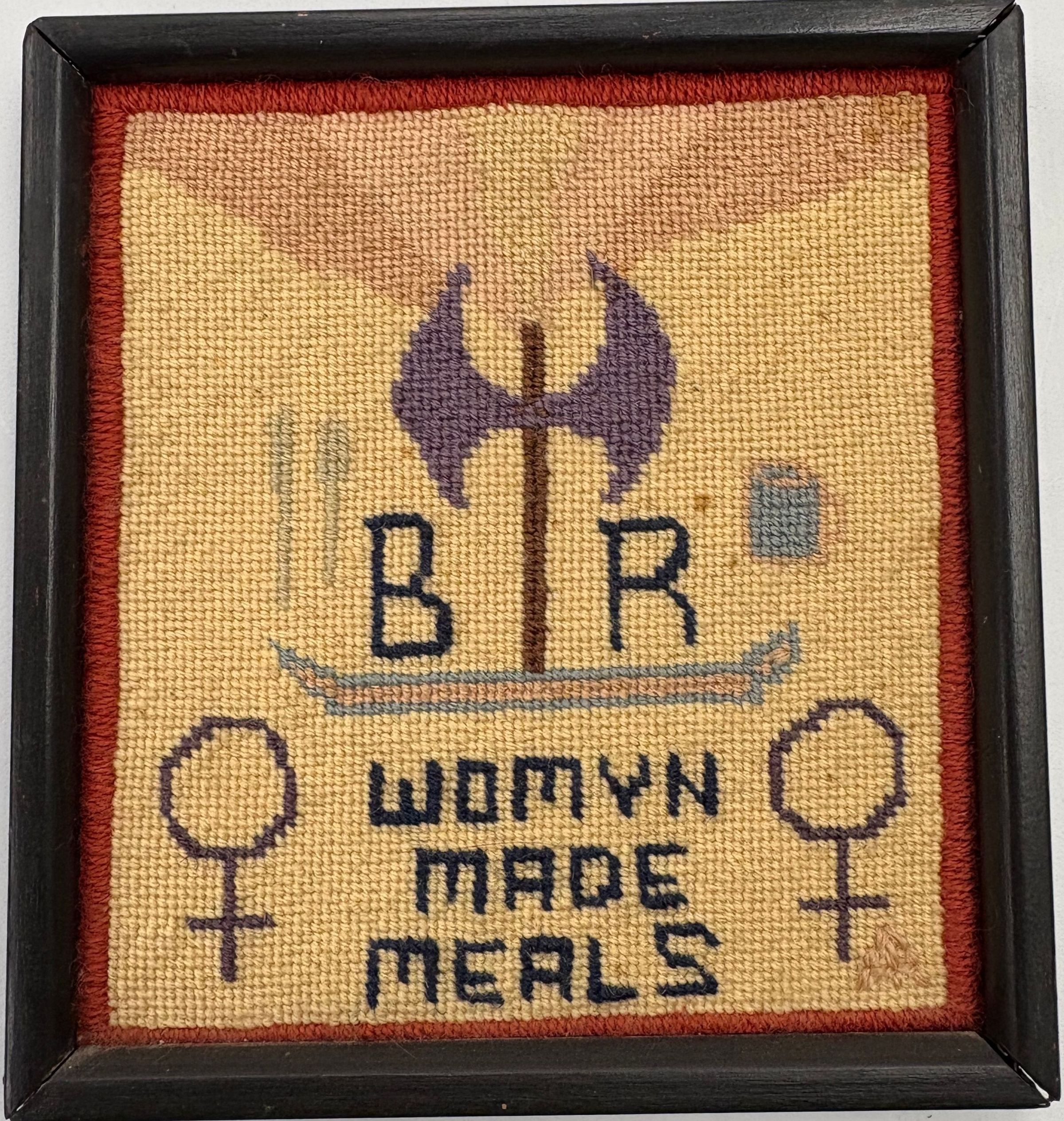 Framed embroidery with labrys, women's symbols, and cutlery, cup, plate with words "B R womyn made meals"Textile Type