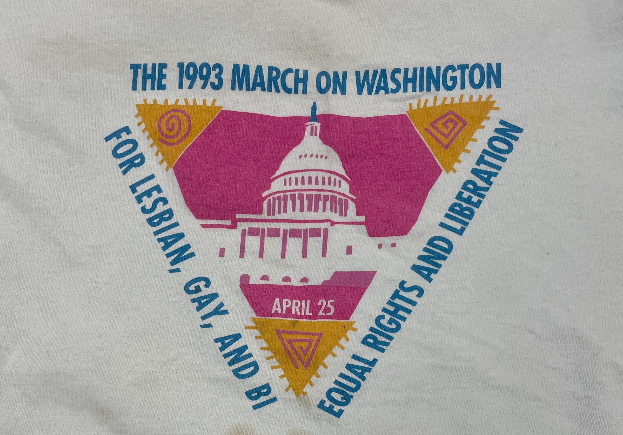 Two black t-shirts and one cream t-shirt depicting the State Capitol building in an inverted triangle. Lettering around the sides reads "The 1993 March on Washington for lesbian, gay, and bi, equal rights and liberation"Context