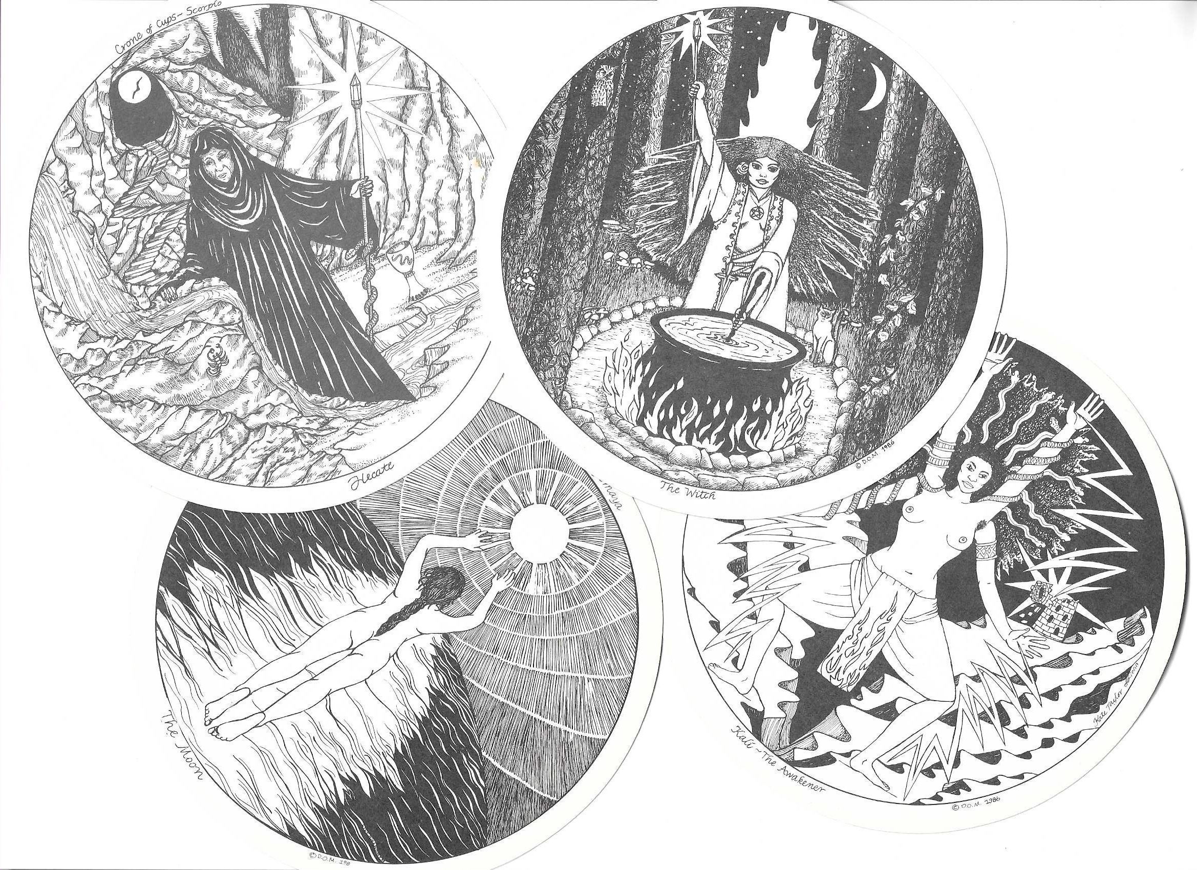 Tarot Cards - round, black and white drawings with bookContext