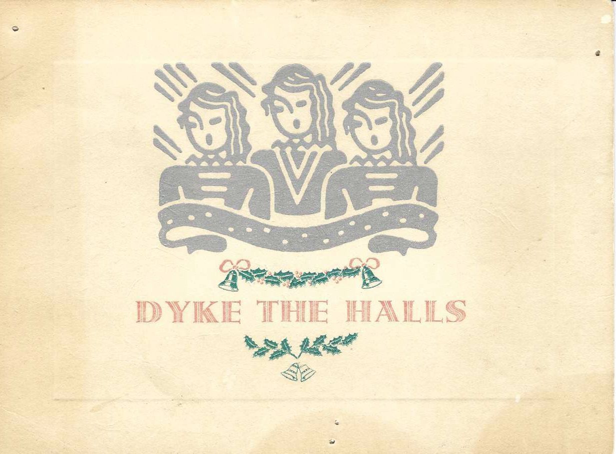 Silk-screened postcard with chorus of women singing. Holly and bells surround the words "Dyke the Halls"Artwork Details