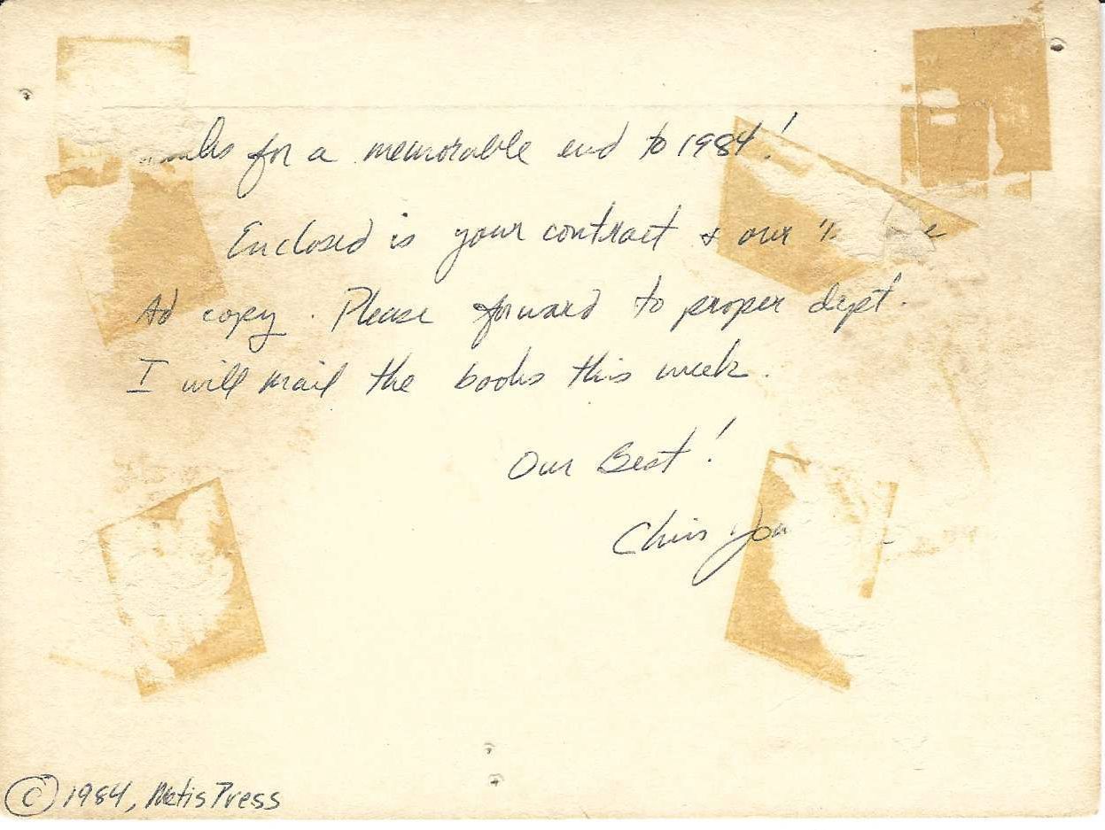 Greeting Card sent from Metis Press to Inland Book Company accompanied by publisher contract for coming year.Create Date