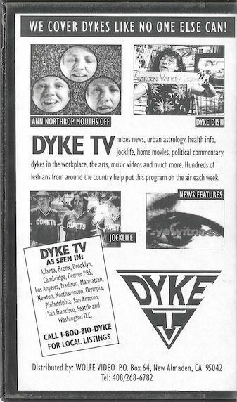 DYKE TV mixes news, urban astrology, health info, jocklife, home movies, political commentary, dykes in the workplace, the arts, music videos and much more. Hundreds of lesbian from around the country help put this program on the air each week. "WE COVER DYKES LIKE NO ONE ELSE CAN!" "This is the television you've been dreaming about..."Context
