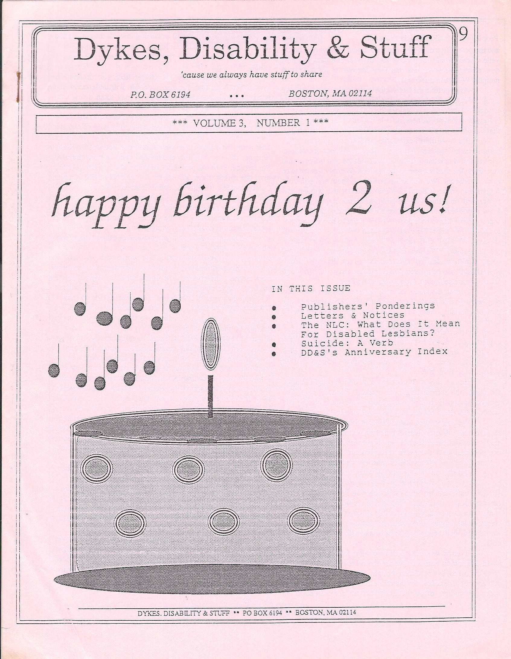 "Dykes, Disability & Stuff" was an irregularly published magazine focused on Lesbians and disabilities. Founded in the summer of 1988 and originally published by Catherine (Lohr) Odette and Sara Karon, it was first produced out of Boston, Massachusetts, but later moved production to Madison, Wisconsin. The magazine was issued in six different formats to accommodate readers with various disabilities. These included standard print, large print, Braille and cassette recording. After losing funding from its Boston sponsor following its 1991 move to Wisconsin, the magazine struggled financially, ultimately ceasing production in the Fall of 2001.Publication Details
