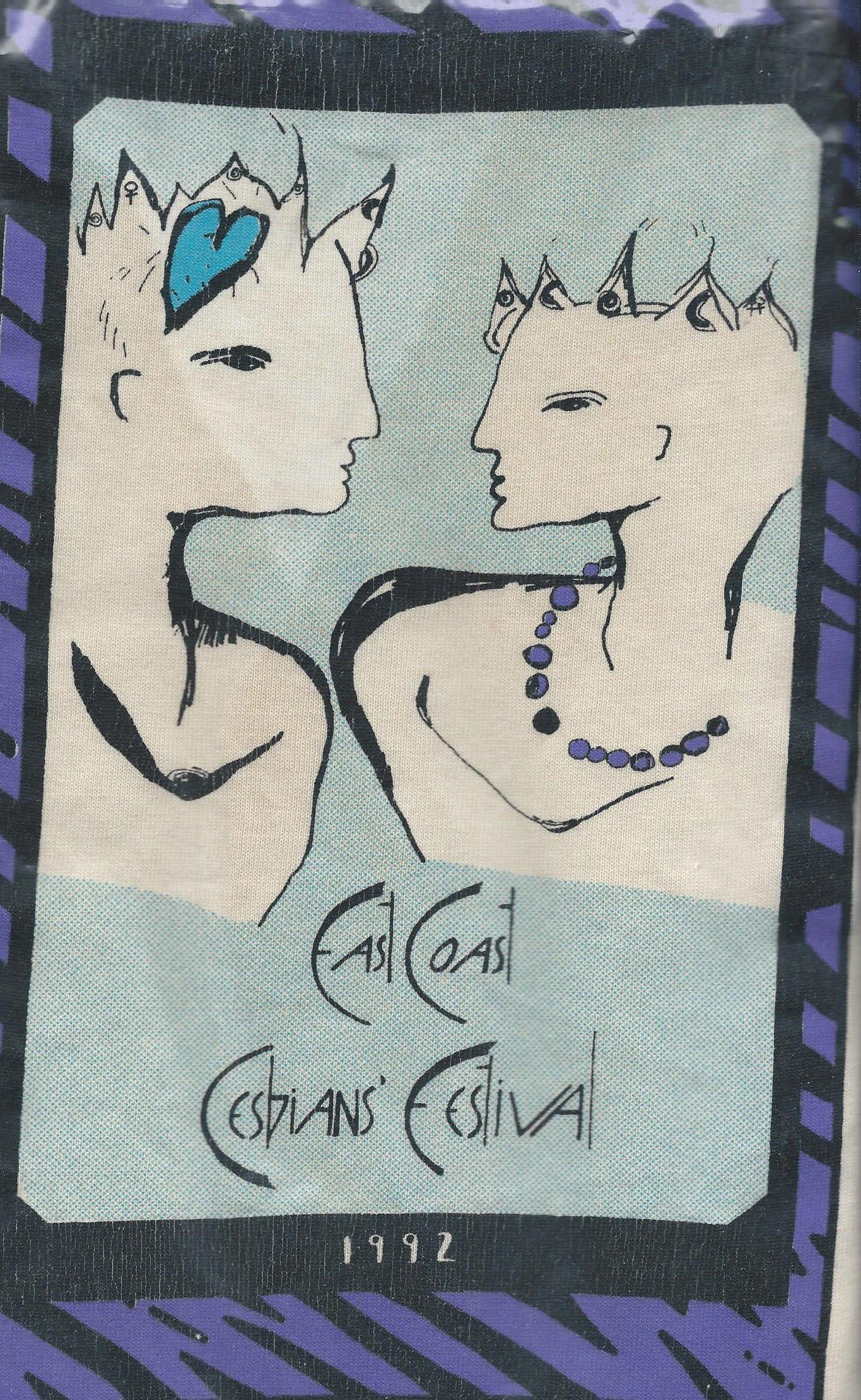 Beige shirt, artistic rendering of two lesbians, east coast lesbian festival logo.Collection