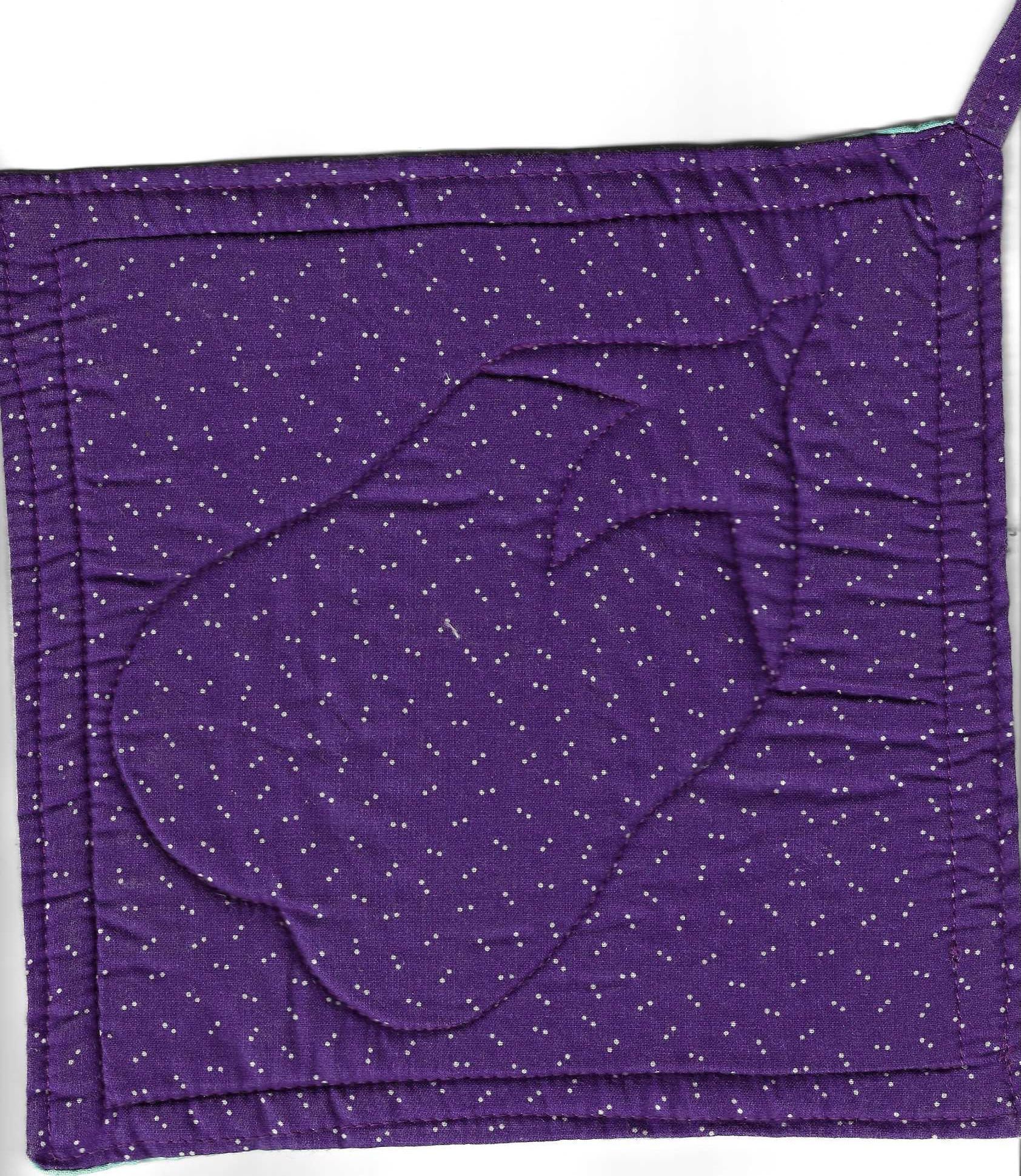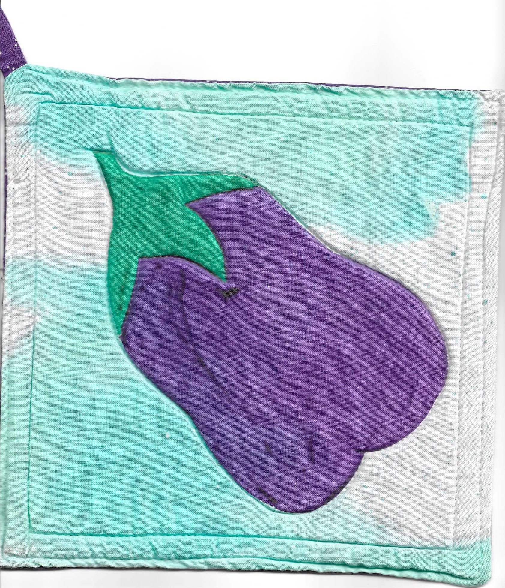 Hand sewn quilted hot mat - front tie-dyed background with bright eggplant - back is purple wit white speckles - can see the reverse outline of the eggplantUse