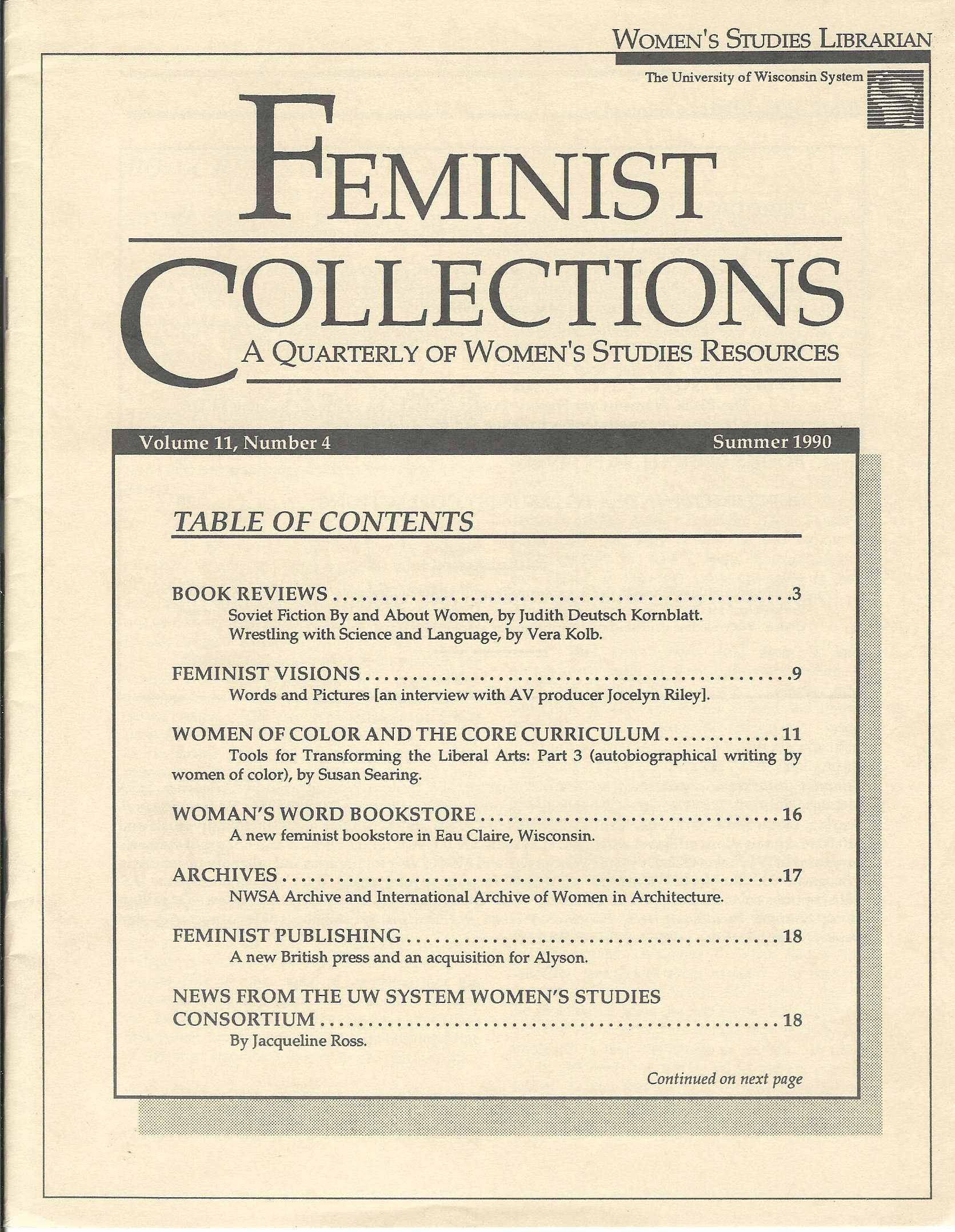 Feminist Collections contains news of the latest print and audiovisual resources for research and teaching in women's studies. The periodical includes book reviews, guides to new bibliographies and reference works, film and video critiques, computer updates, and news of materials including pamphlets, reports, rare book dealers' catalogs, microforms, and more.