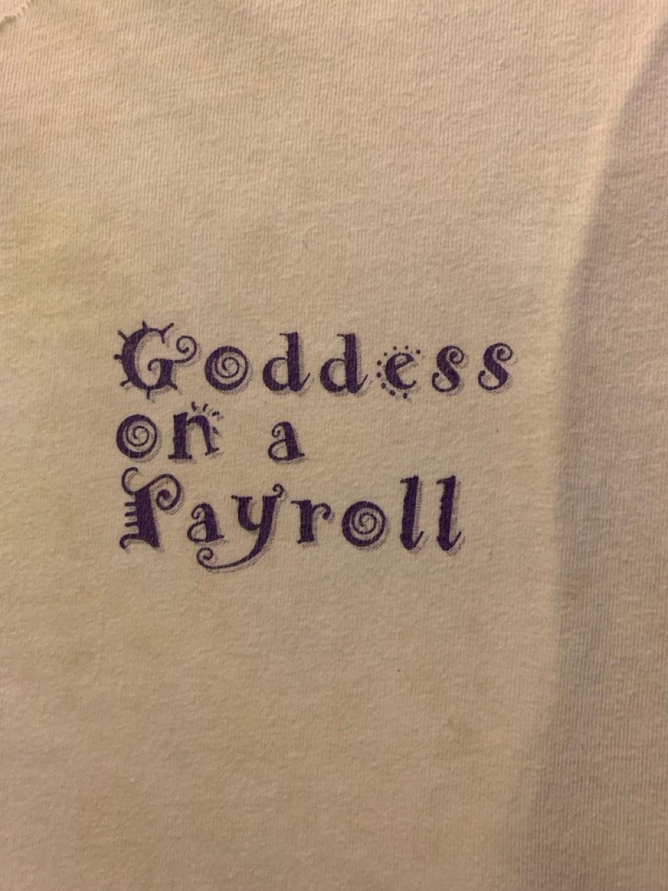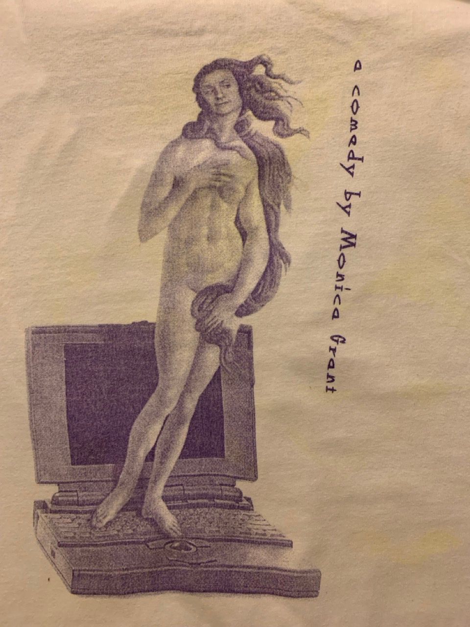 Back image of goddess standing on open laptop with text "a comedy by Monica Grant"Clothing/Dress/Costume Details