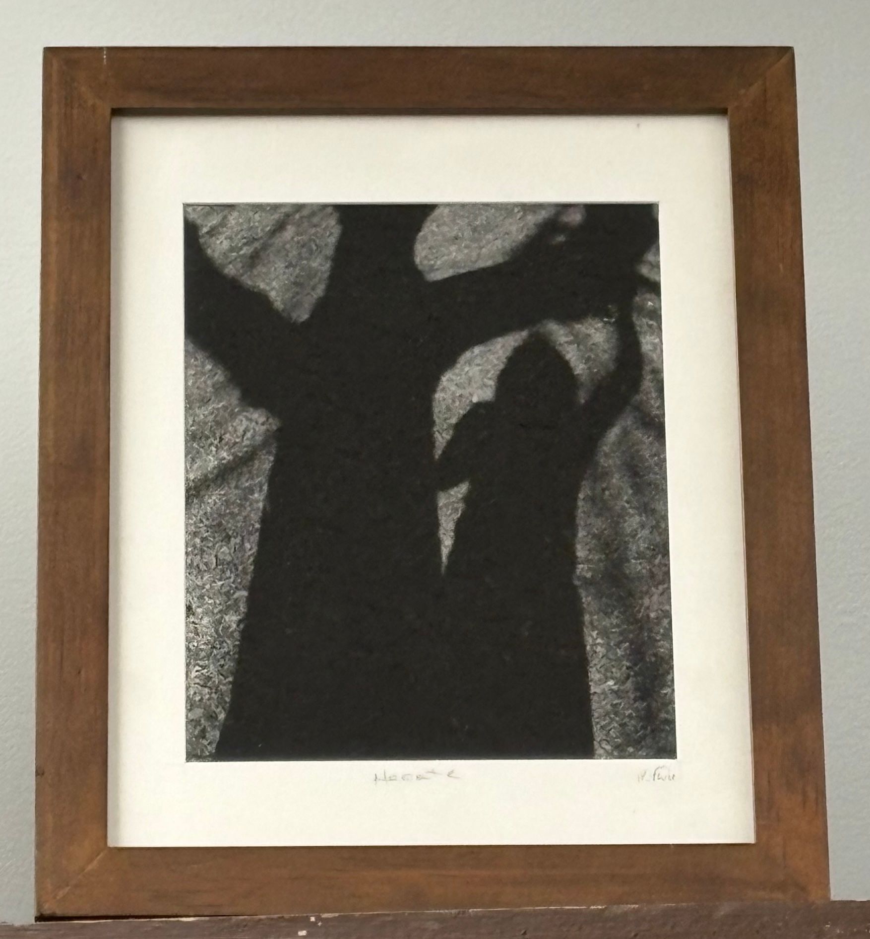 Framed 5x7 - black and white photograph of shadow figure near tree trunkContext