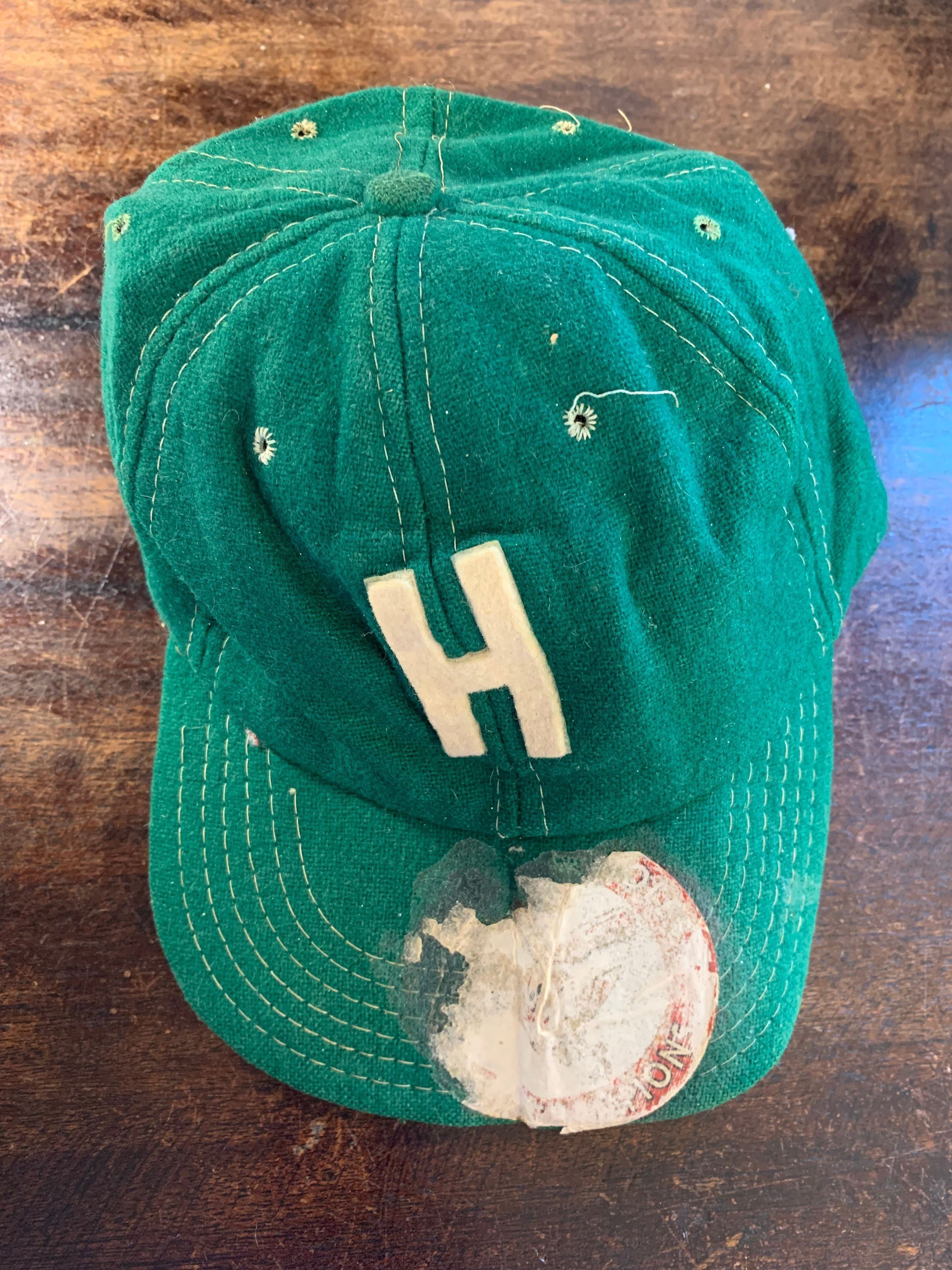 Green softball cap with letter H and remnants of an Oriole Baseball team stickerUse