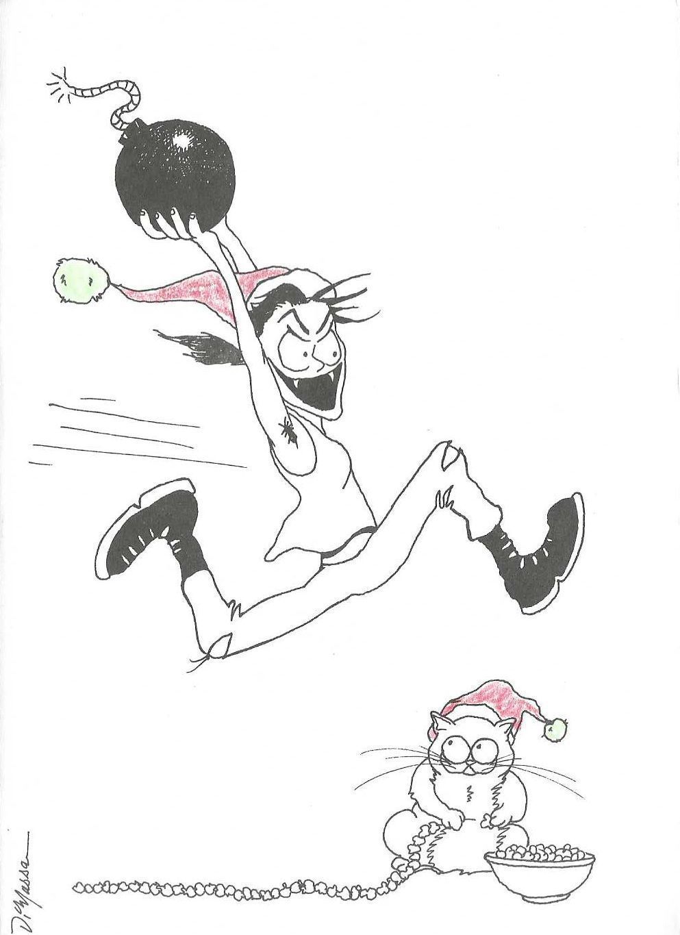 Hothead Paisan running with a bomb - wearing a Santa hat while Chicken the cat (also wearing a Santa hat) strings popcorn.Artwork Details