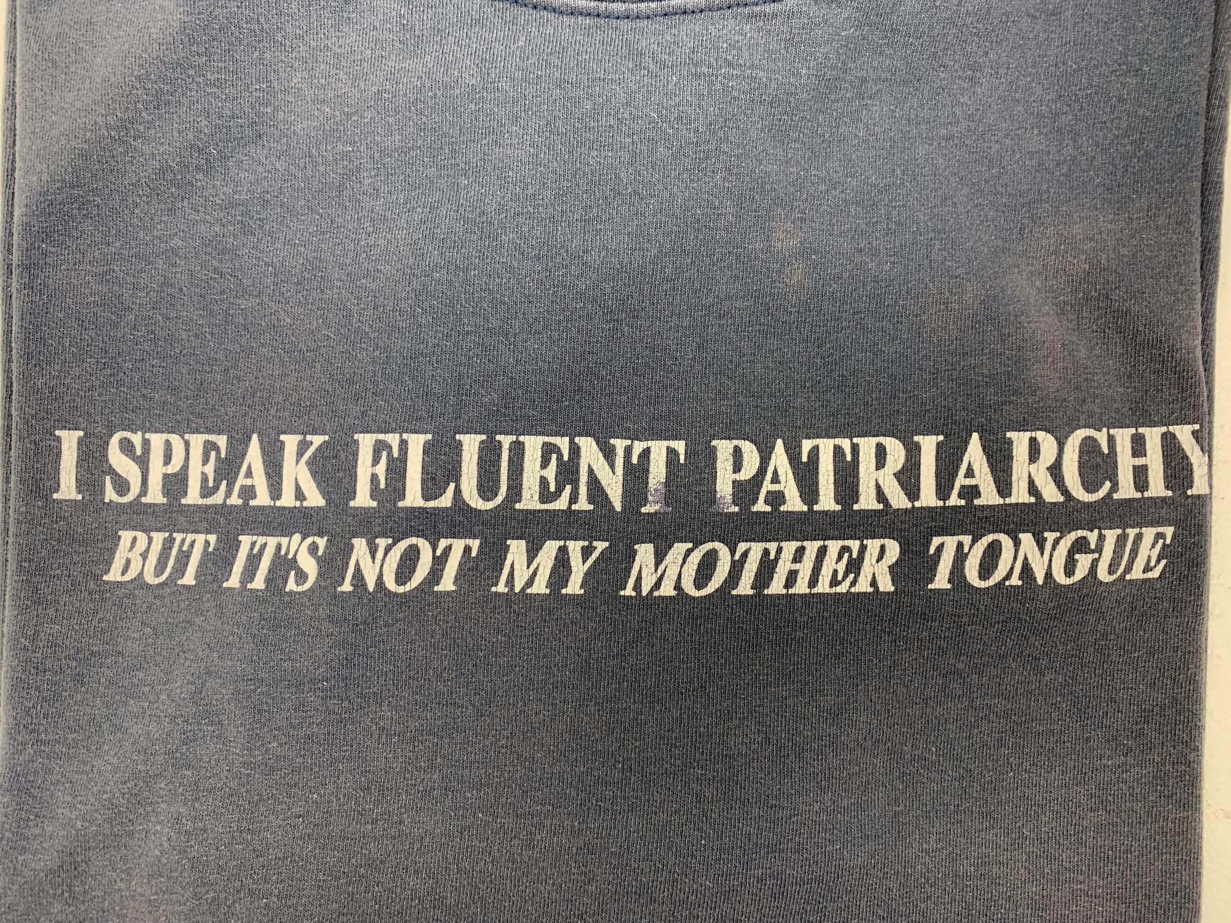 Text: "I speak fluent patriarchy but it's not my mother tongue"Clothing/Dress/Costume Details