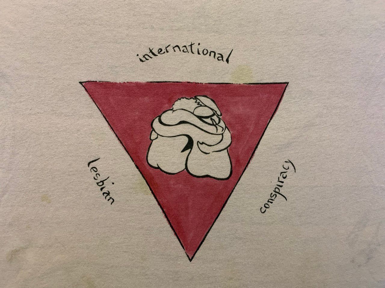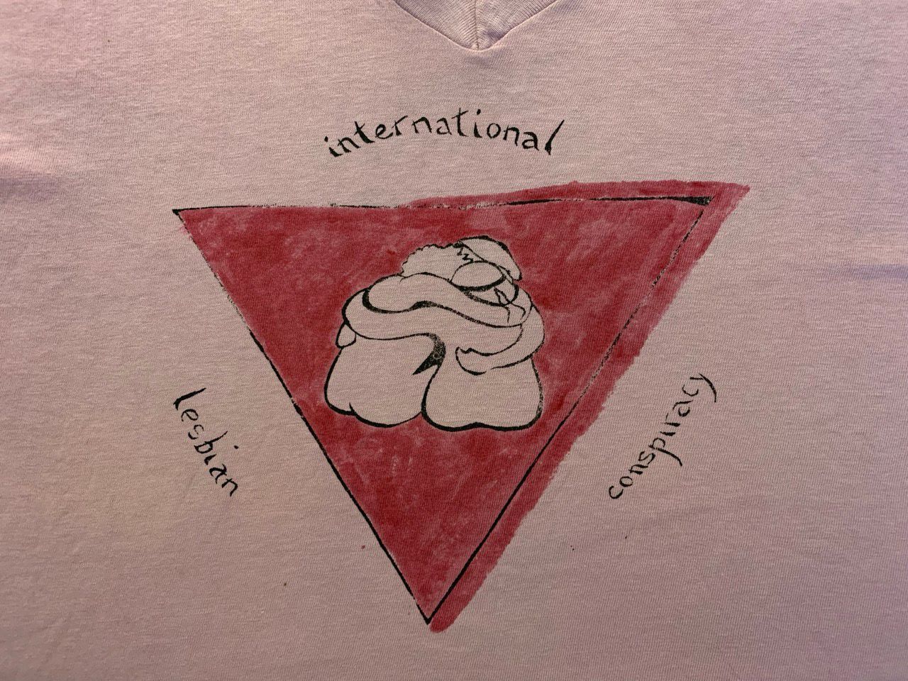 Pink triangle with three lesbians hugging in the middle. Handmade silkscreen, limited quantity.Clothing/Dress/Costume Details