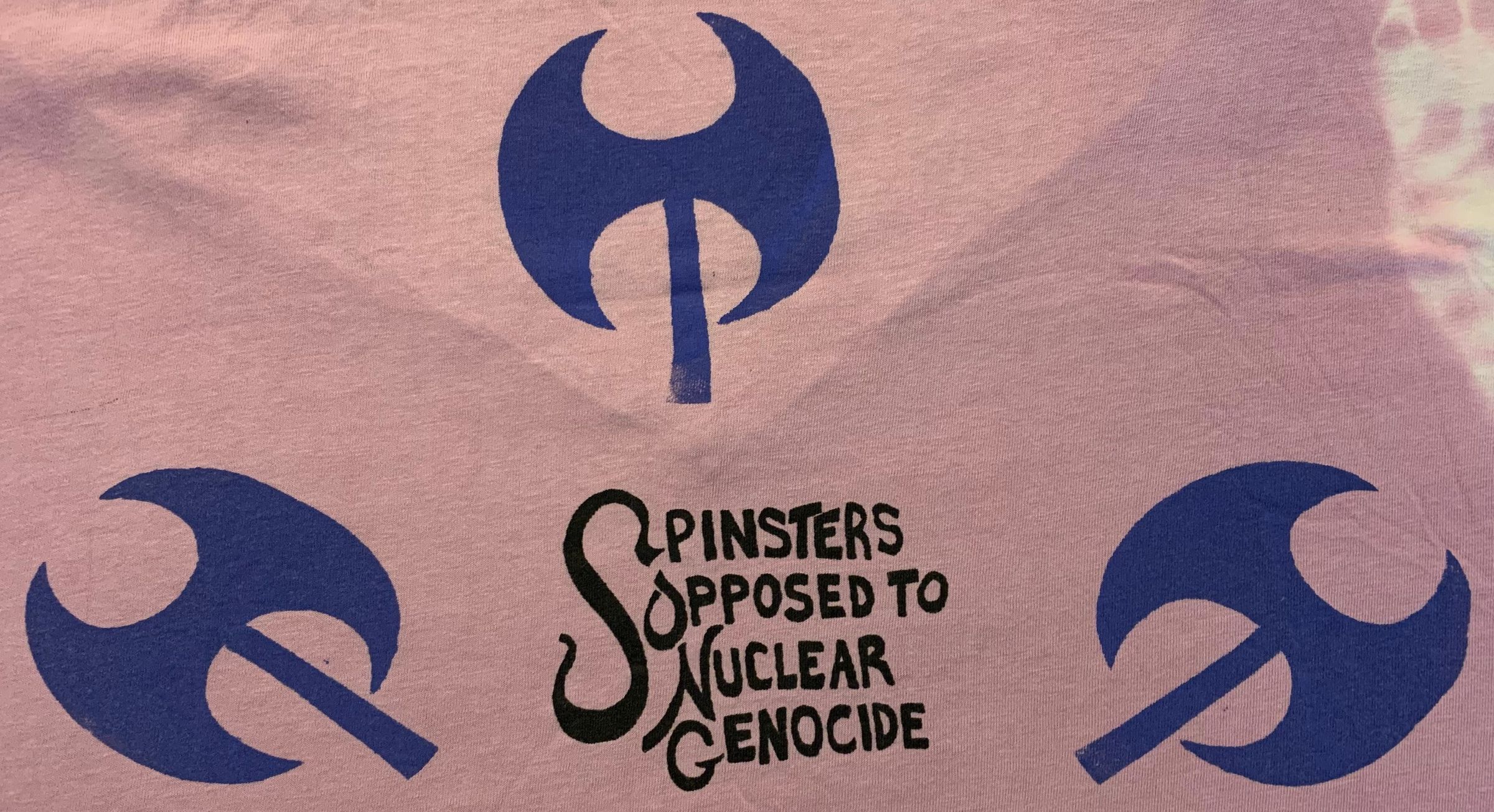 Pink triangle with three lesbians hugging in the middle. Handmade silkscreen, limited quantity. Back design of three labrys with Spinsters Opposed to Nuclear Genocide.Clothing/Dress/Costume Details