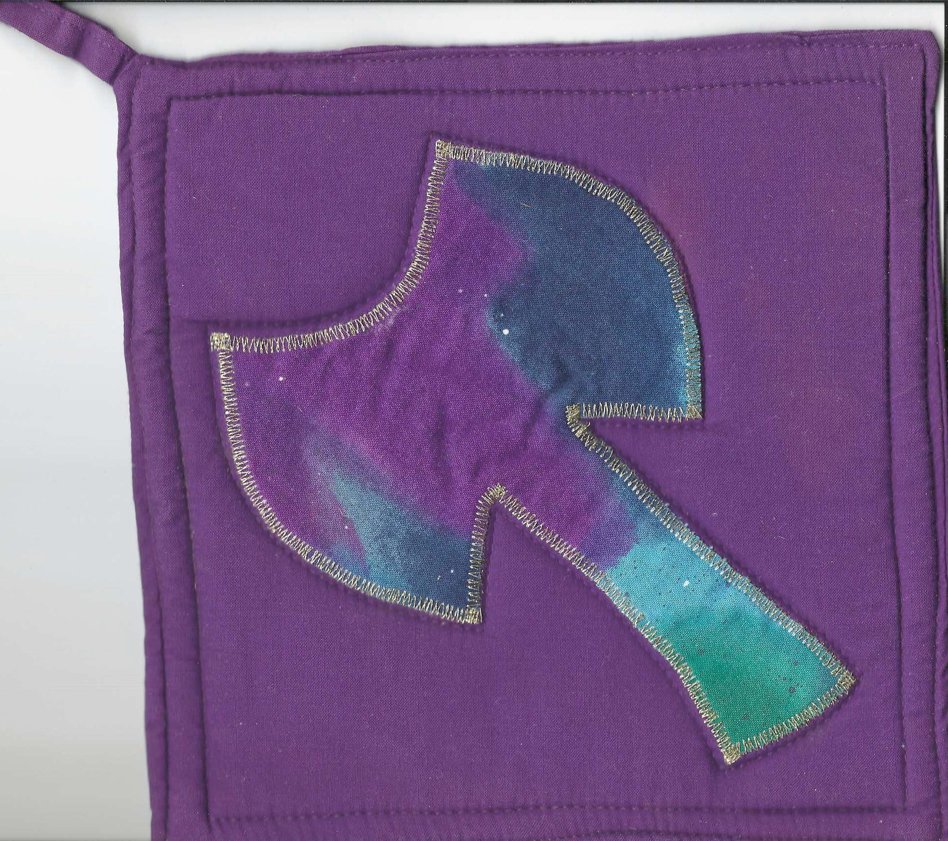 tie-dyed labrys - blue/green/purple with gold stitching around borderCondition
