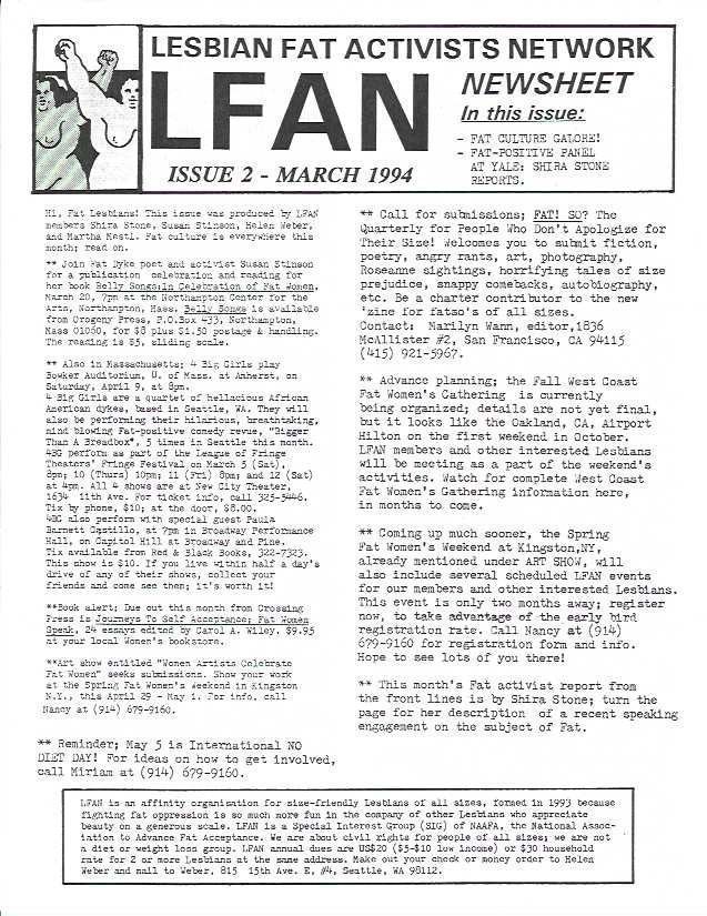 LFAN was an affinity organization for size-friendly Lesbians of all sizes. formed in 1993 because fat oppression is so much more fun in the company of other Lesbians who appreciate beauty on a generous scale. LFAN was a special interest group of NAAFA (National Association to Advance Fat Acceptance).Publication Details