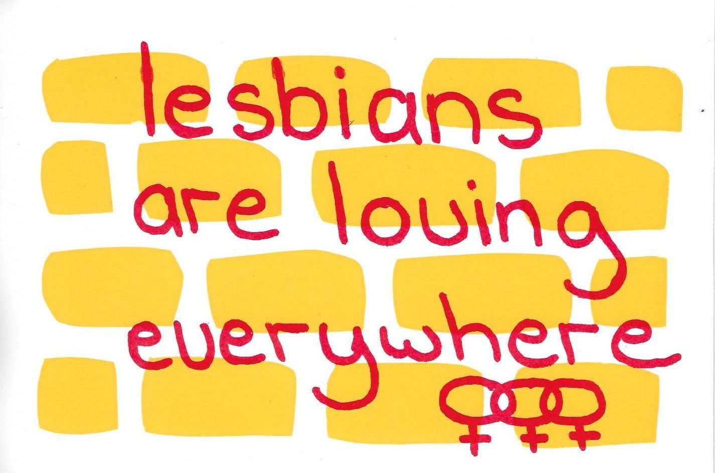 Silk-screened postcard - Lesbians are loving everywhere with three women's symbolsArtwork Details