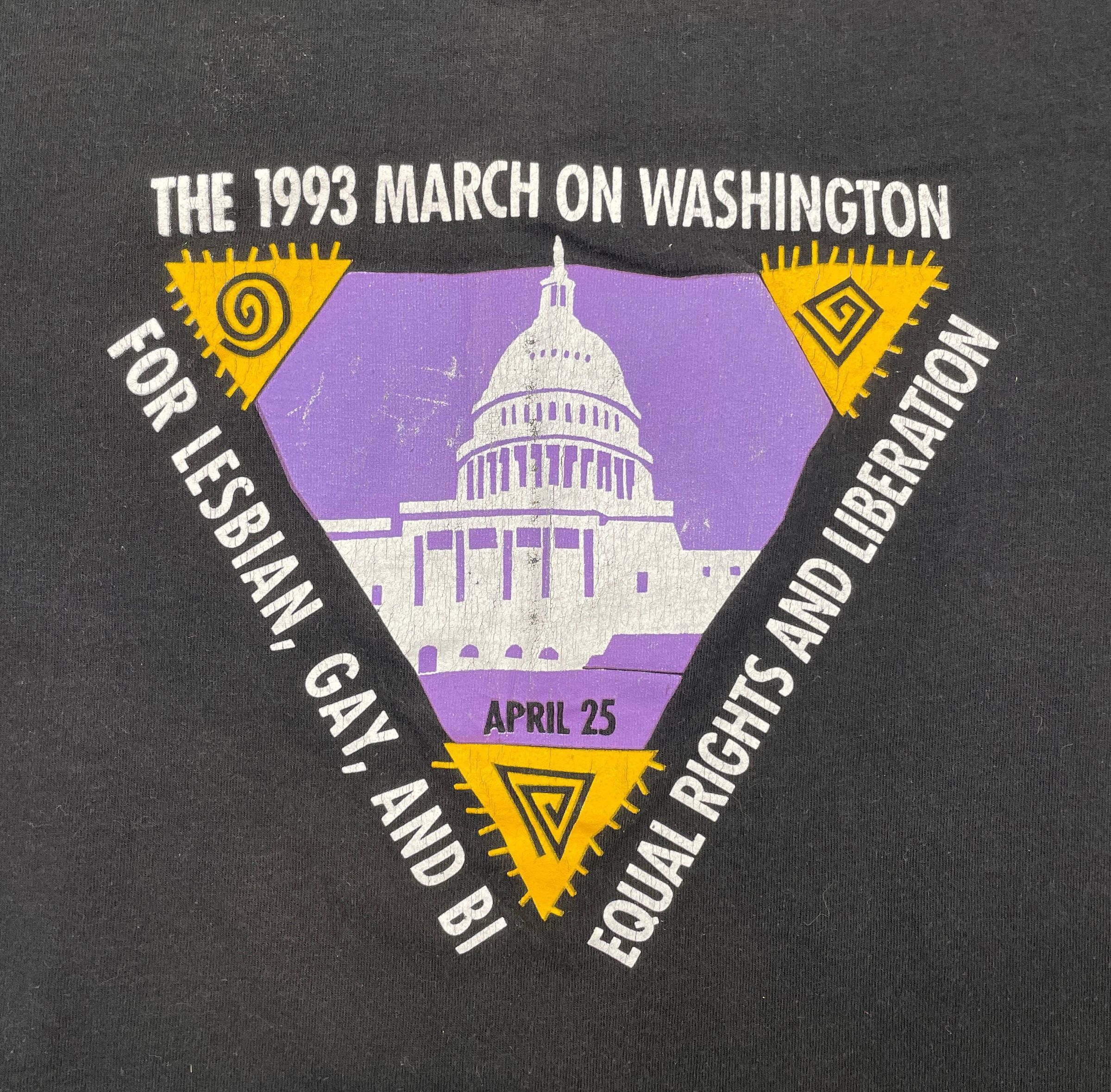 Two black t-shirts and one cream t-shirt depicting the State Capitol building in an inverted triangle. Lettering around the sides reads "The 1993 March on Washington for lesbian, gay, and bi, equal rights and liberation"Context